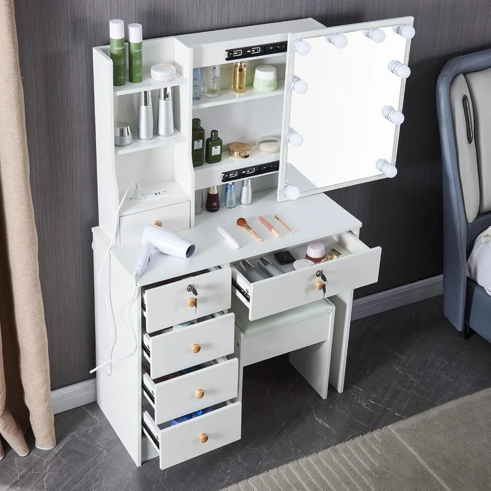 Makeup Vanity with LED Mirror & Power Outlet, White Makeup Vanity Set, Clearance Makeup Vanity with 3 Lighting Colors, Brightnes