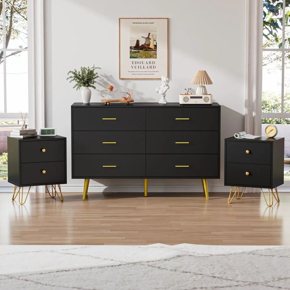 Black 6-Drawer Dresser and Two-Piece Nightstand Set for Modern Bedroom in Black and Gold