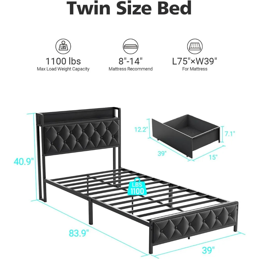 Storage-Friendly Twin Bed Frame with PU Leather Button Headboard and Metal Support Platform featuring Outlets for Easy Assembly