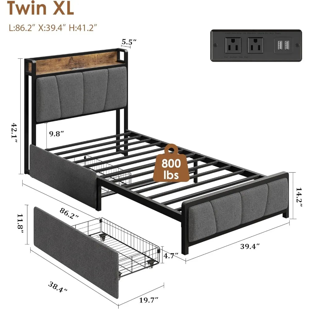 Rustic Linen-Covered Twin XL Platform Bed with Storage Drawers and Charging Station