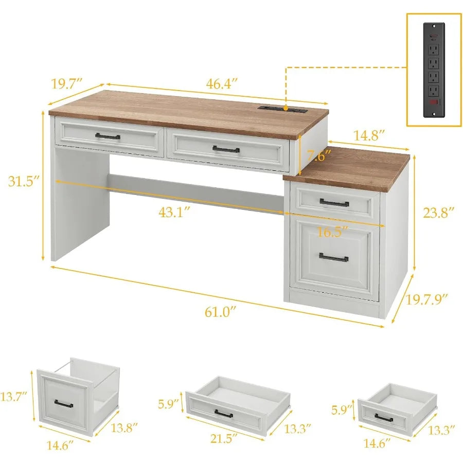 "61-inch Farmhouse Style L-Shaped Executive Office Desk with File Storage and Power Outlets"