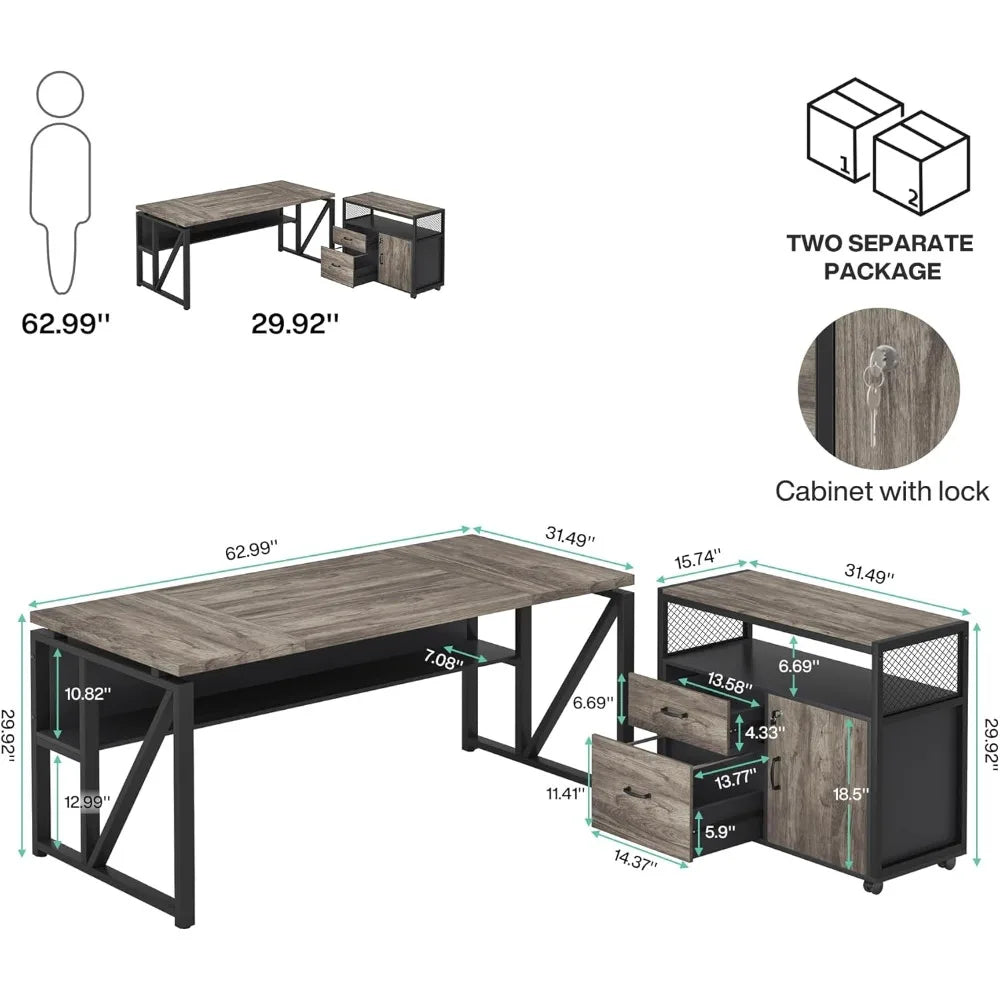 Executive Corner Desk with Storage, 63 Computer Desk and File Cabinet, 2-Piece Office Furniture Set