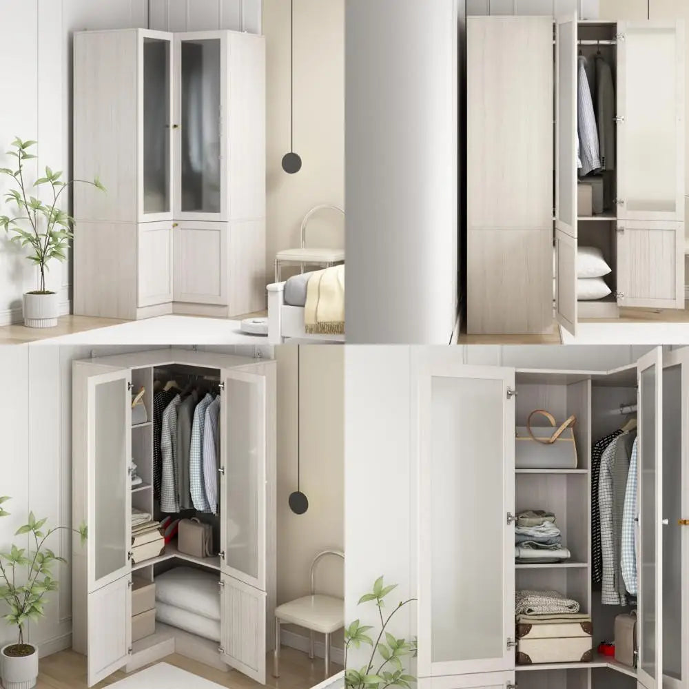 Wooden Bedroom Wardrobe Cabinet with Frosted Glass Doors, Storage Armoire Closet for Clothes, Shelves & Hanging Rod Space-Saving