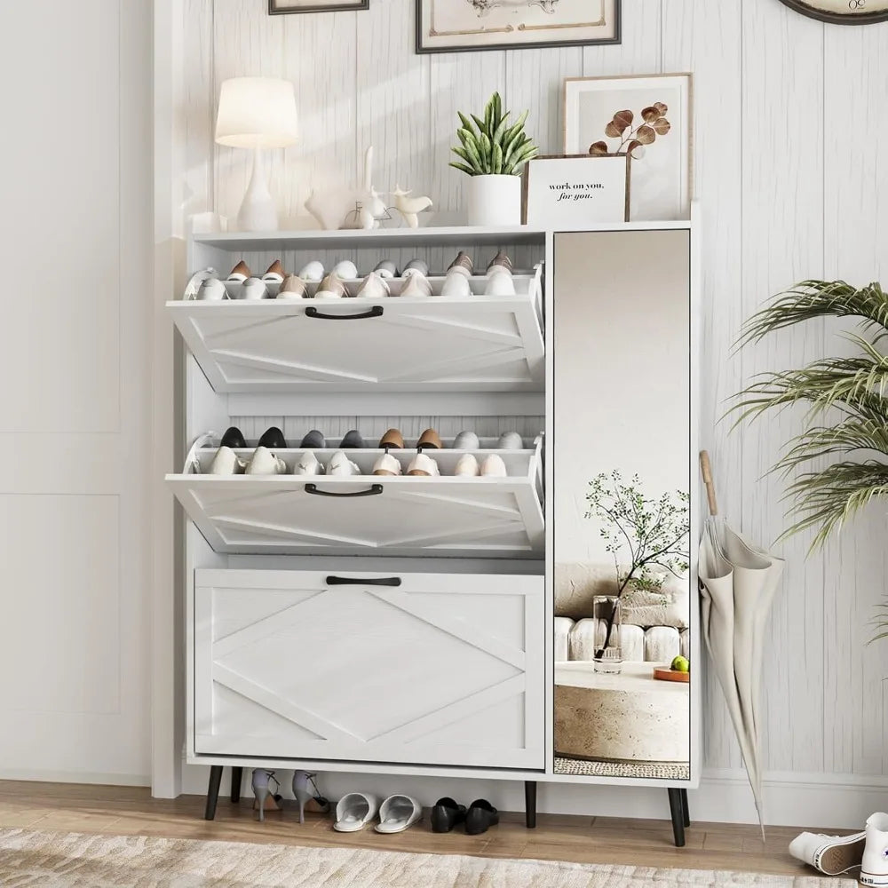 Shoe Cabinet with 3 Flip Drawers & Mirror, Hidden Shoe Storage Cabinet with 5 Wooden Legs, Slim Shoe Rack Cabinet with Shelves