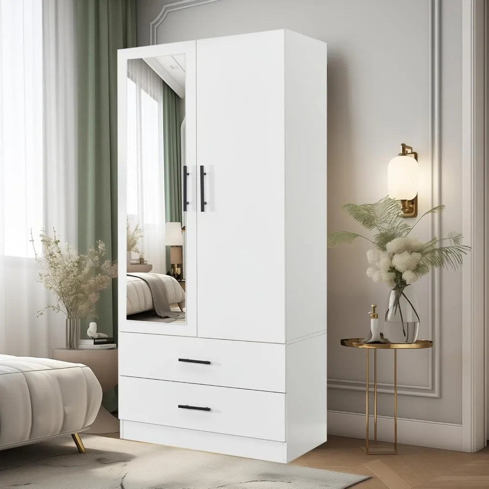 Wood Armoire Wardrobe Closet with Mirror,2 Door Bedroom Armoires with 2 Drawers, Large Wardrobe Closet Storage Cabinet with Hang