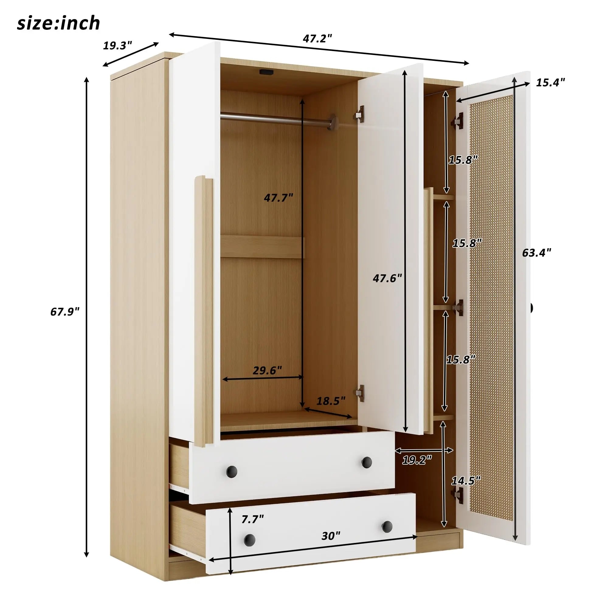 Armoire Wardrobe Closet with 2 Drawers and 3 Doors, Bedroom Armoire Wardrobe Cabinet with Hanging Rod and Rattan Door,Wooden Clo