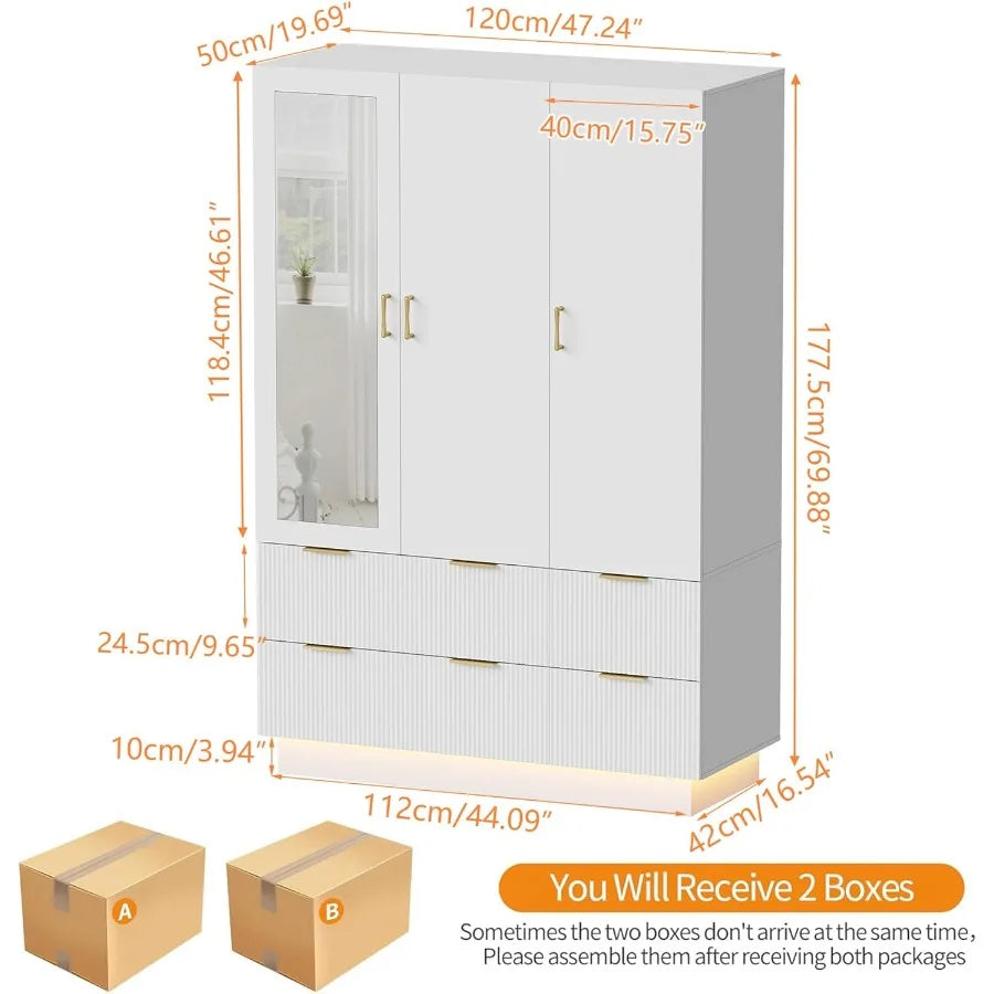 Armoire Wardrobe Closet with 3 Door Bedroom Armoires with Mirror and LED Lights Hanging Rod Drawers Large Capacity Storage Ward