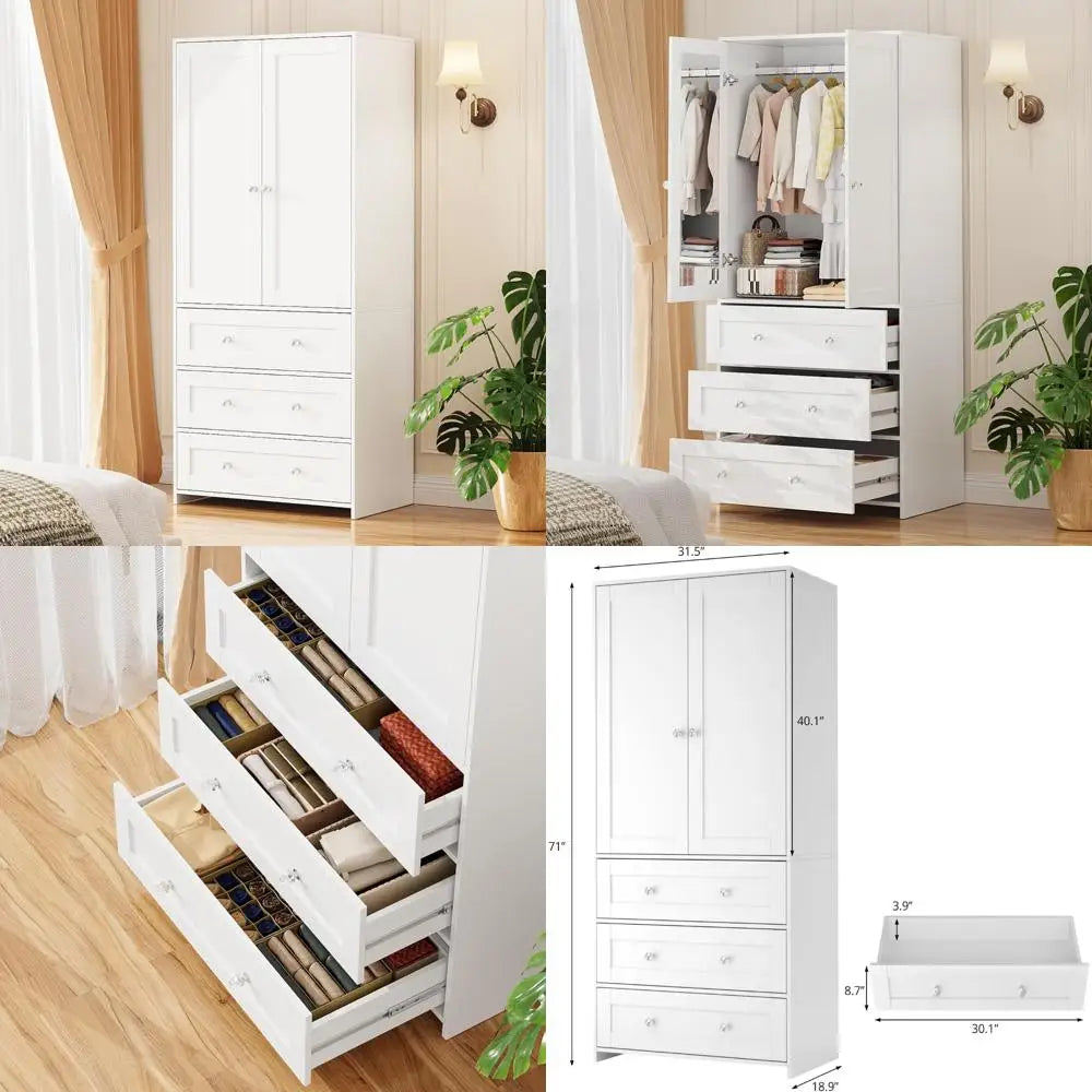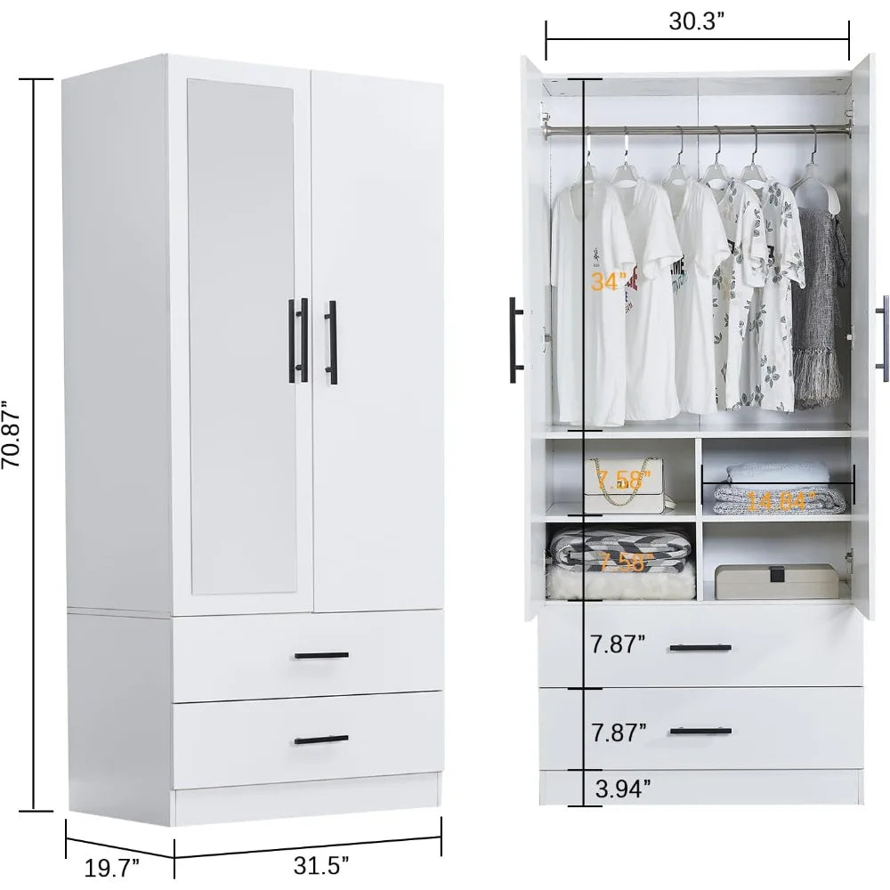 Wooden Wardrobe Closet with Hanging Rod, Drawers, and Mirror, 71-Inch Clothing Storage Cabinet with Two Doors