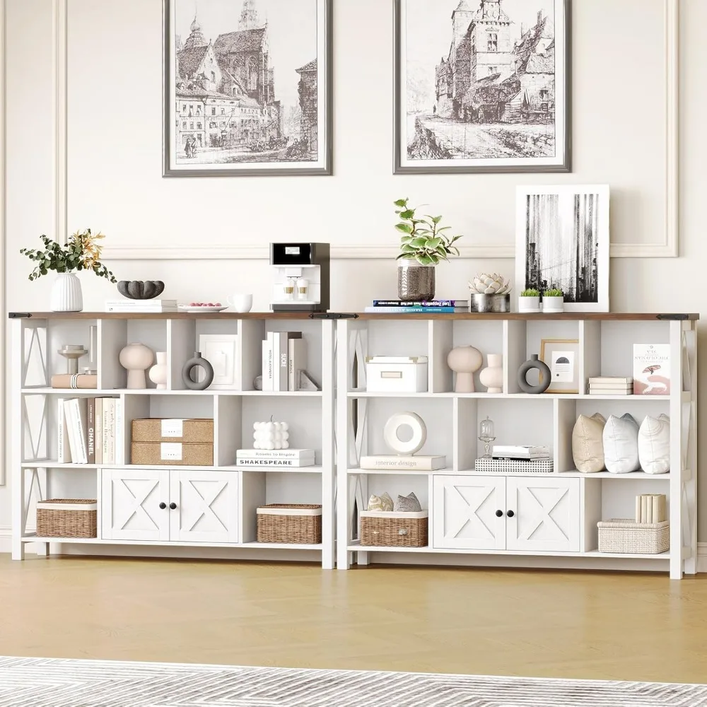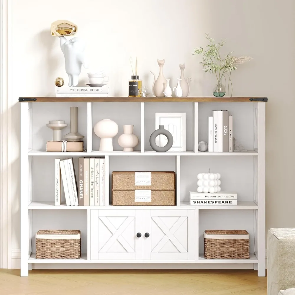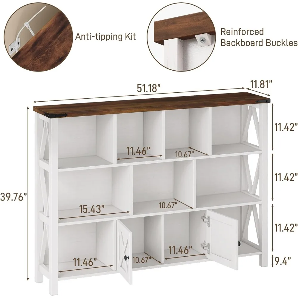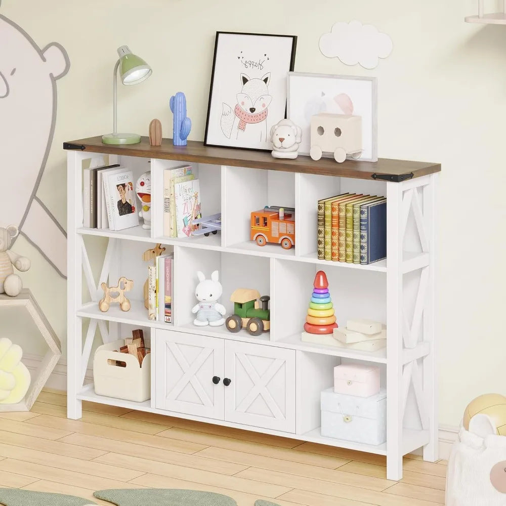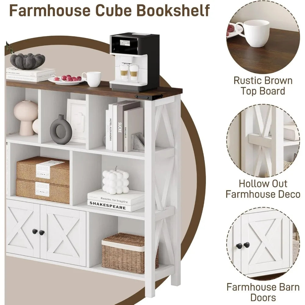 - 【11 Cube Storage Shelf with 𝐒𝐦𝐚𝐥𝐥 𝐁𝐚𝐫𝐧 𝐃𝐨𝐨𝐫】 wood book shelf has a total of 11 cube organizer storage space, and a spacious top space and a small door cabinet. The farmhouse bookshelf is ideal choice for placing and displaying your books, kids book and toy, decorations, framed photos, plants and other items. It helps you organize the items in your room and keep it tidy.