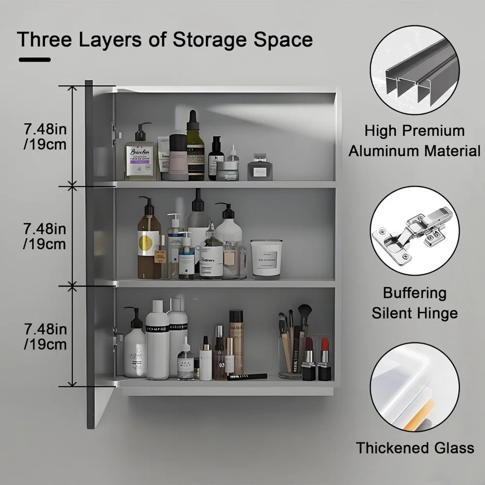 - Storage Behind The Mirror: Medicine cabinet with mirror has three layers of storage space. Whether it is daily skin care products, cosmetics, or small home furnishings, they can be easily accommodated to meet your diverse storage needs and make your bathroom space more tidy and orderly