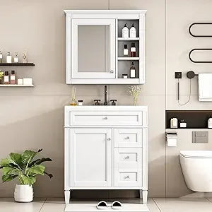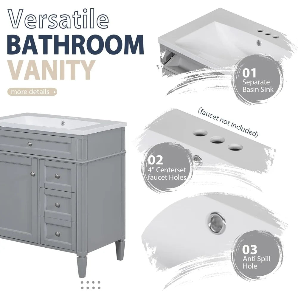 - High-quality Material: Our bathroom vanity with single sink features a solid wood base and a waterproof finish, making the vanity body sturdy and durable, the smooth surface of the ceramic sink and vanity top are easy to clean, with high quality hinges and DTC rails, Achieving a damping effect, soft closing and opening, and no noise.