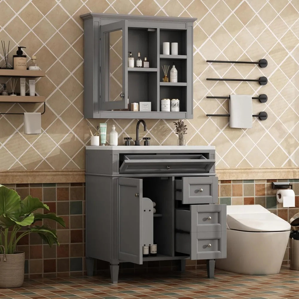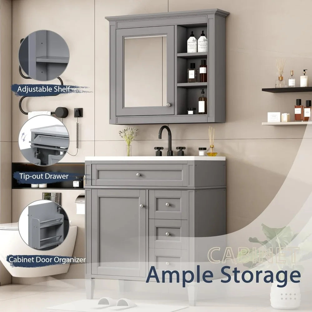 - Matching Mirror Medicine Cabinet - With 3 open shelves for often-used items and 1 hidden storage shelf behind the mirror, the wall mount mirror cabinet is perfect for maximizing bathroom space.