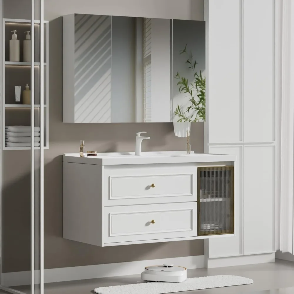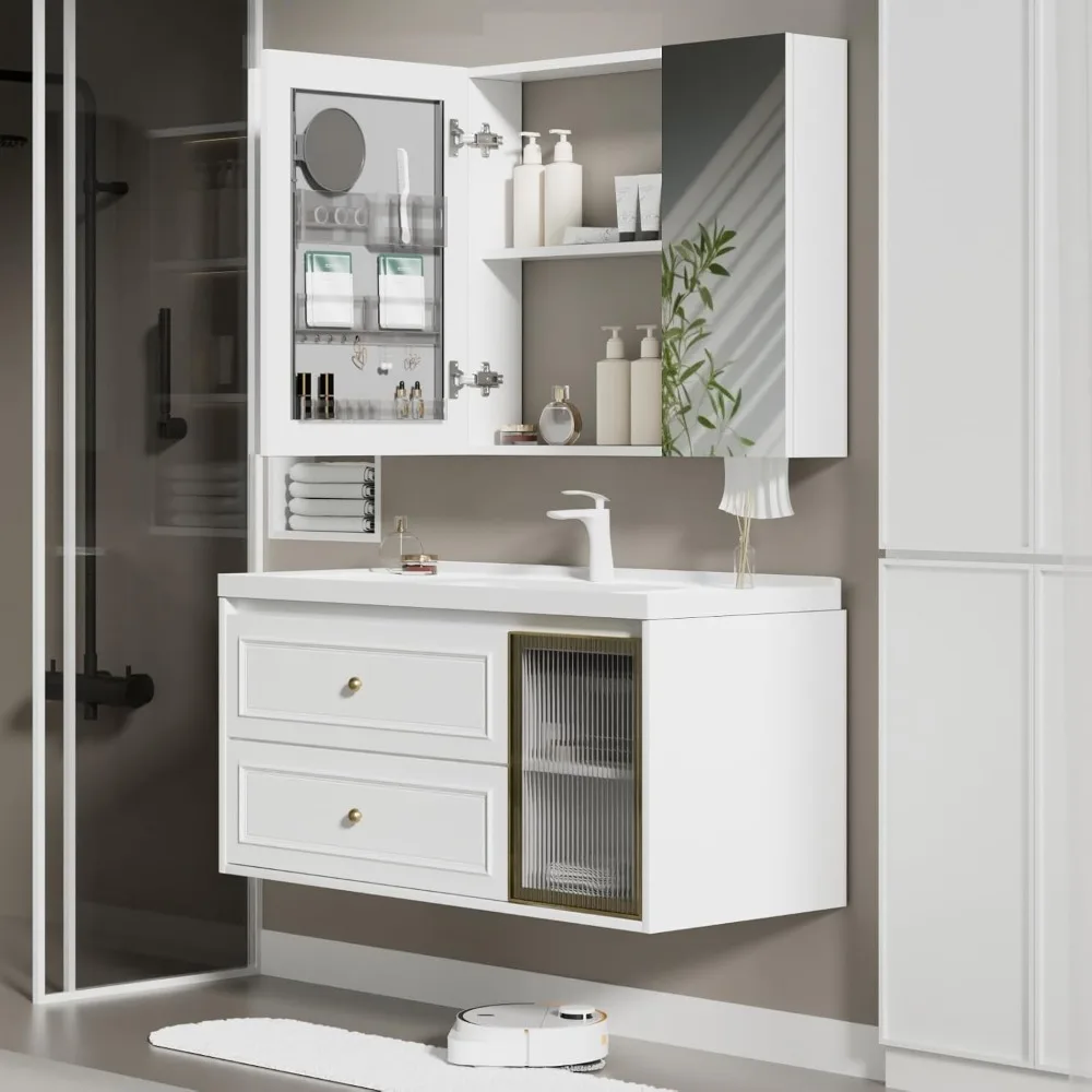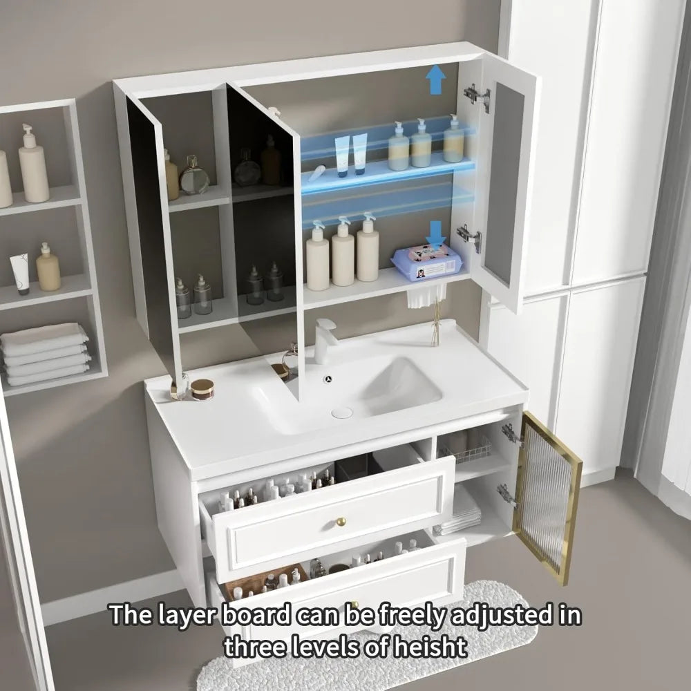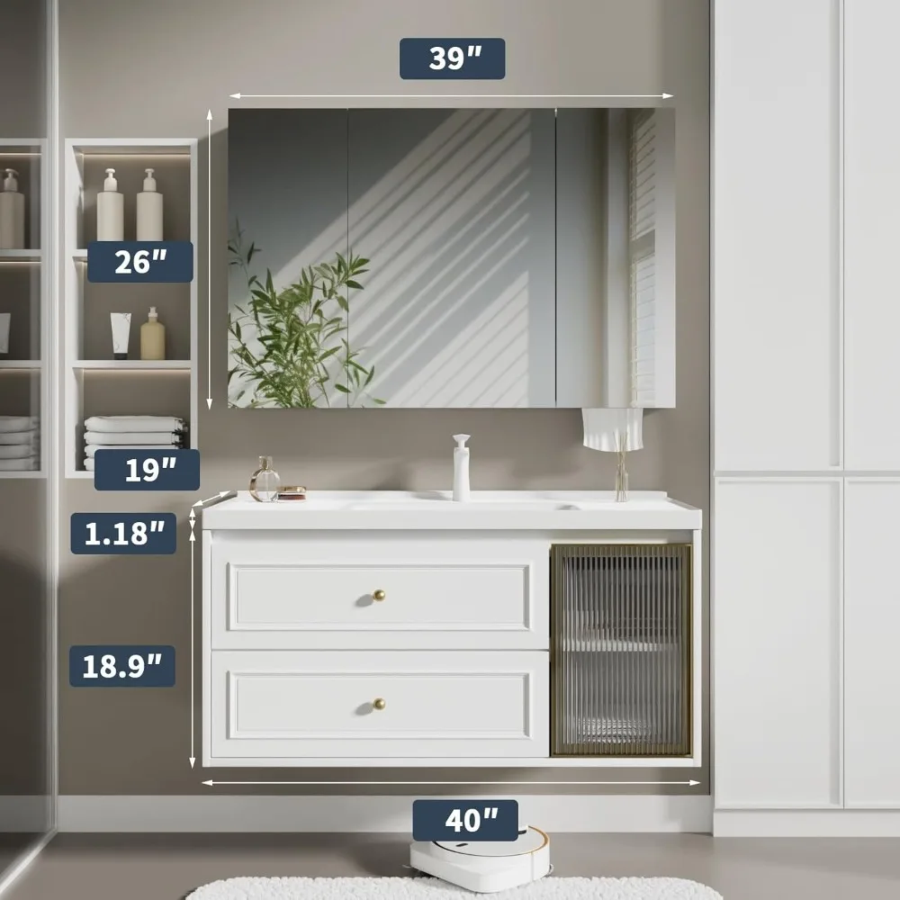 - 【All-In-One Bathroom Set】Are you still struggling to find a fitting wall mounted vanity for your medicine cabinet mirror? Our all-in-one mirror cabinet and sink cabinet combo perfectly decorates your bathroom bringing harmony, style and beauty, Seamless integration of vanity & mirror cabinet doubles vertical storage, with elevated base preventing moisture buildup and simplifying floor cleaning.