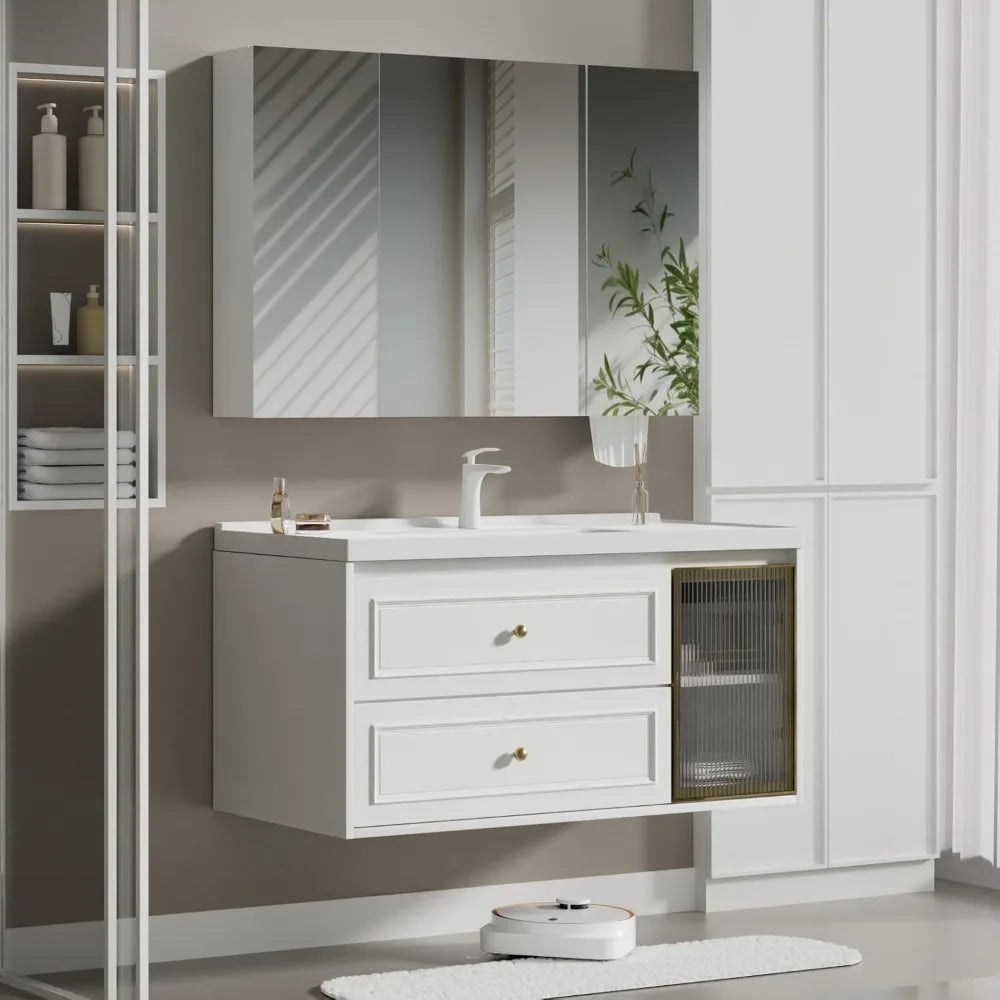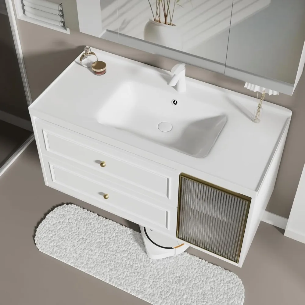 - 【Floating Sink Bathroom Vanity】Featuring 3D fluted drawer fronts with soft-close slides on the base to ensure a quiet, gradual closure, the floating sink bathroom vanity ingeniously coordinating aesthetic appeal with functional refinement.