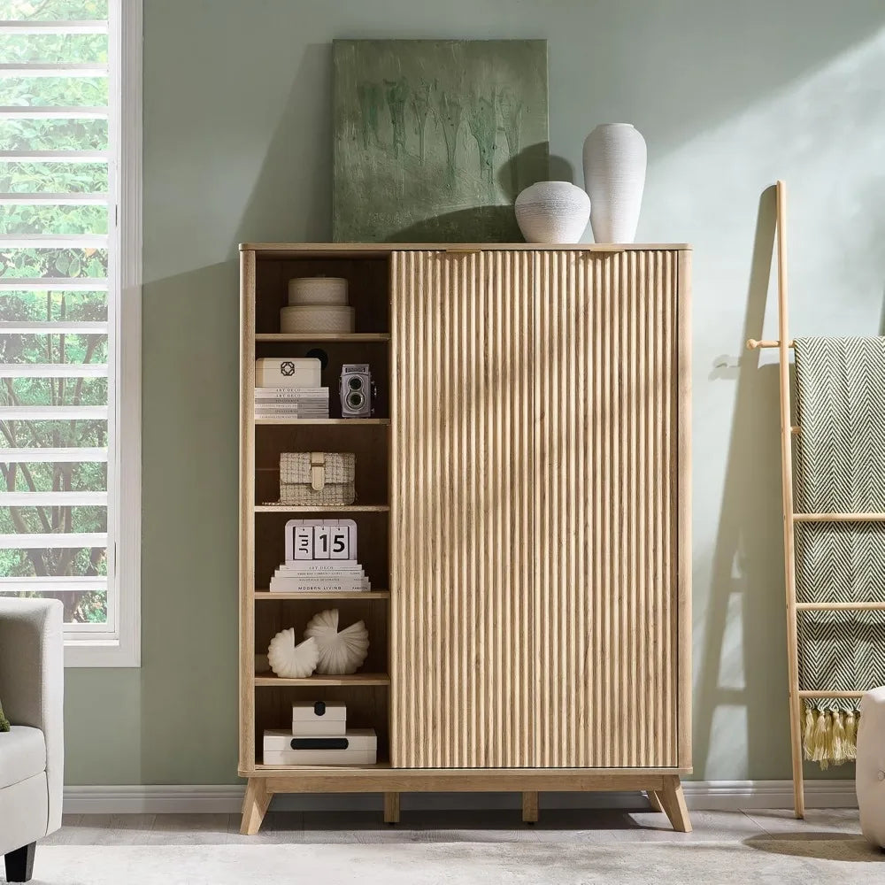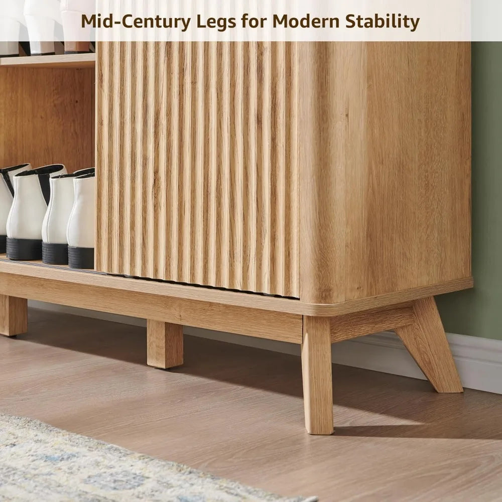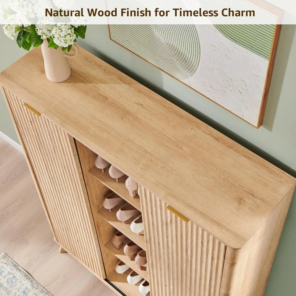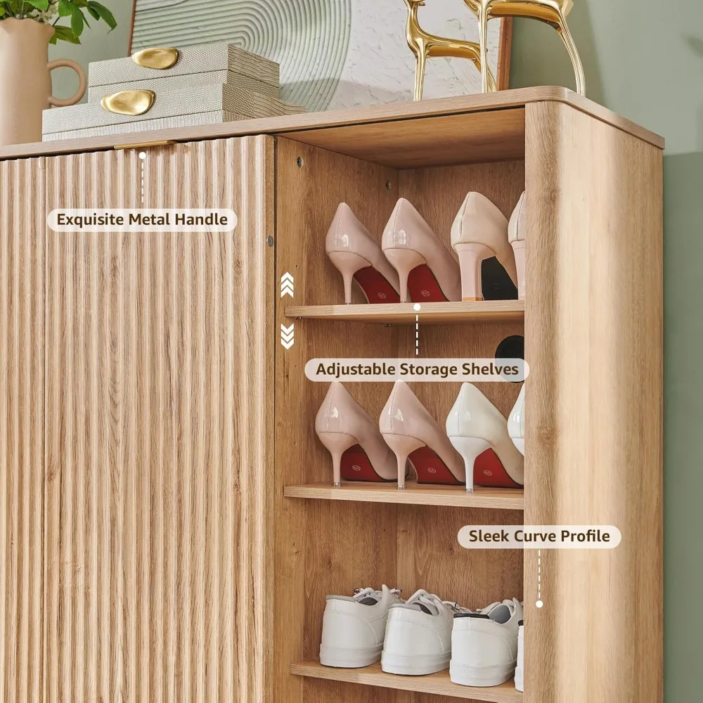 This cabinet boasts a stylish fluted design that complements a variety of home decor styles, from farmhouse to contemporary. It features two sliding doors and six adjustable shelves on each side, providing ample space for up to 32 pairs of shoes, including boots. The center shelves are versatile, allowing you to store plants, books, or decorative items, ensuring your space remains organized and elegant. Beyond being a shoe cabinet, this unit can serve as an entryway organizer, living room display, or dining room sideboard, thanks to its adjustable shelves and spacious interior. Made from durable, high-quality FSC-Certified engineered wood, it is built to last with elevated wooden legs for stability and easy cleaning. An anti-tip kit is included for safety, and sleek metal handles add to both the durability and style. Assembly is quick and easy, requiring only 90 minutes or less with detailed instructions and labeled parts. Designed for two-person assembly, our support team is available to assist if needed.