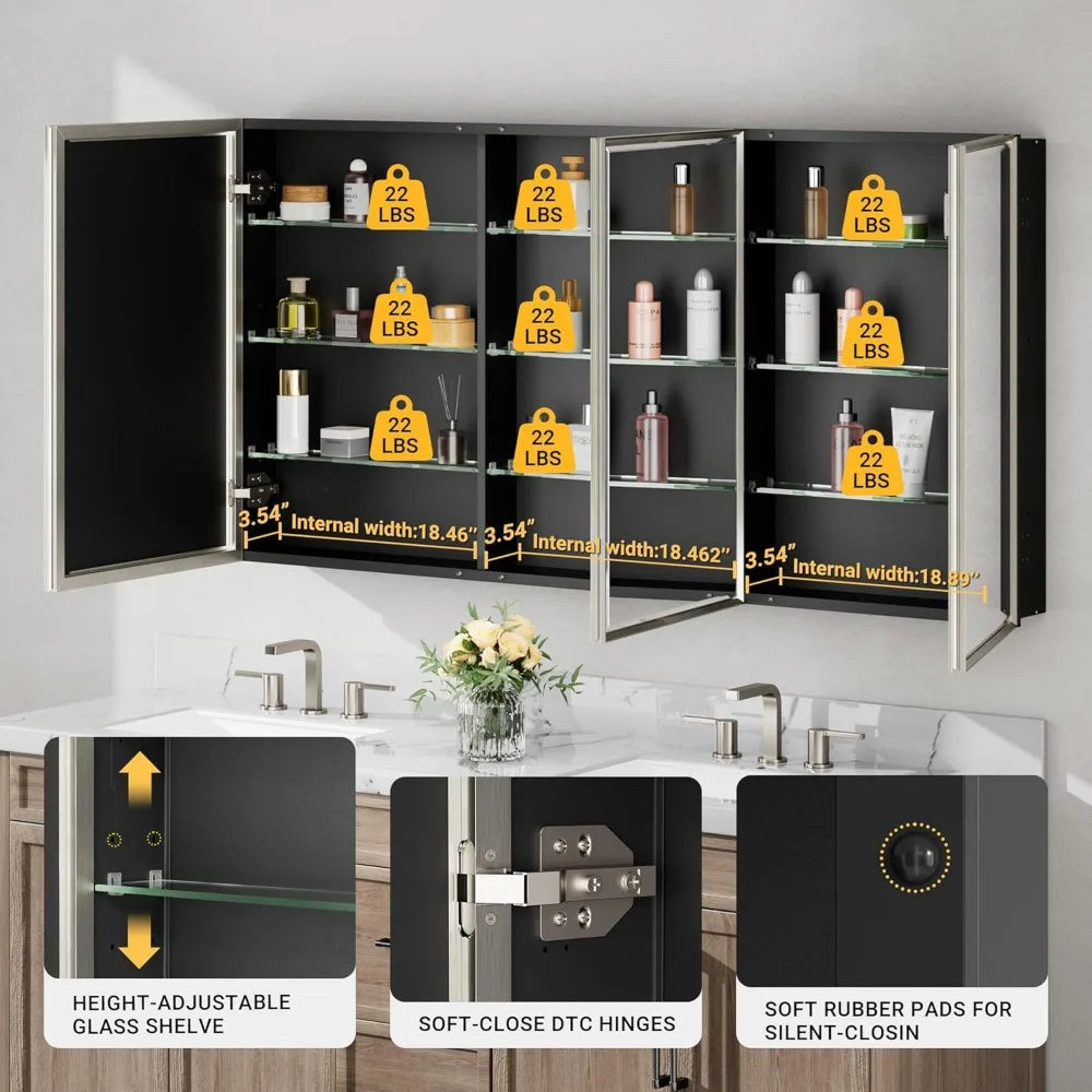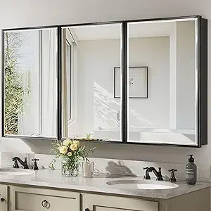 - 【HD Eco-Friendly Mirror & Adjustable Glass Shelves】The mirror is a 3RD eco-friendly mirror known for its excellent oxidation resistance and low heavy metal content, preventing darken, black spots, or edges. The mirror surface is ultra-flat with no distortion, providing 100% HD reflection. Inside, it features height-adjustable tempered glass shelves, which are stain-resistant, and easy to clean.