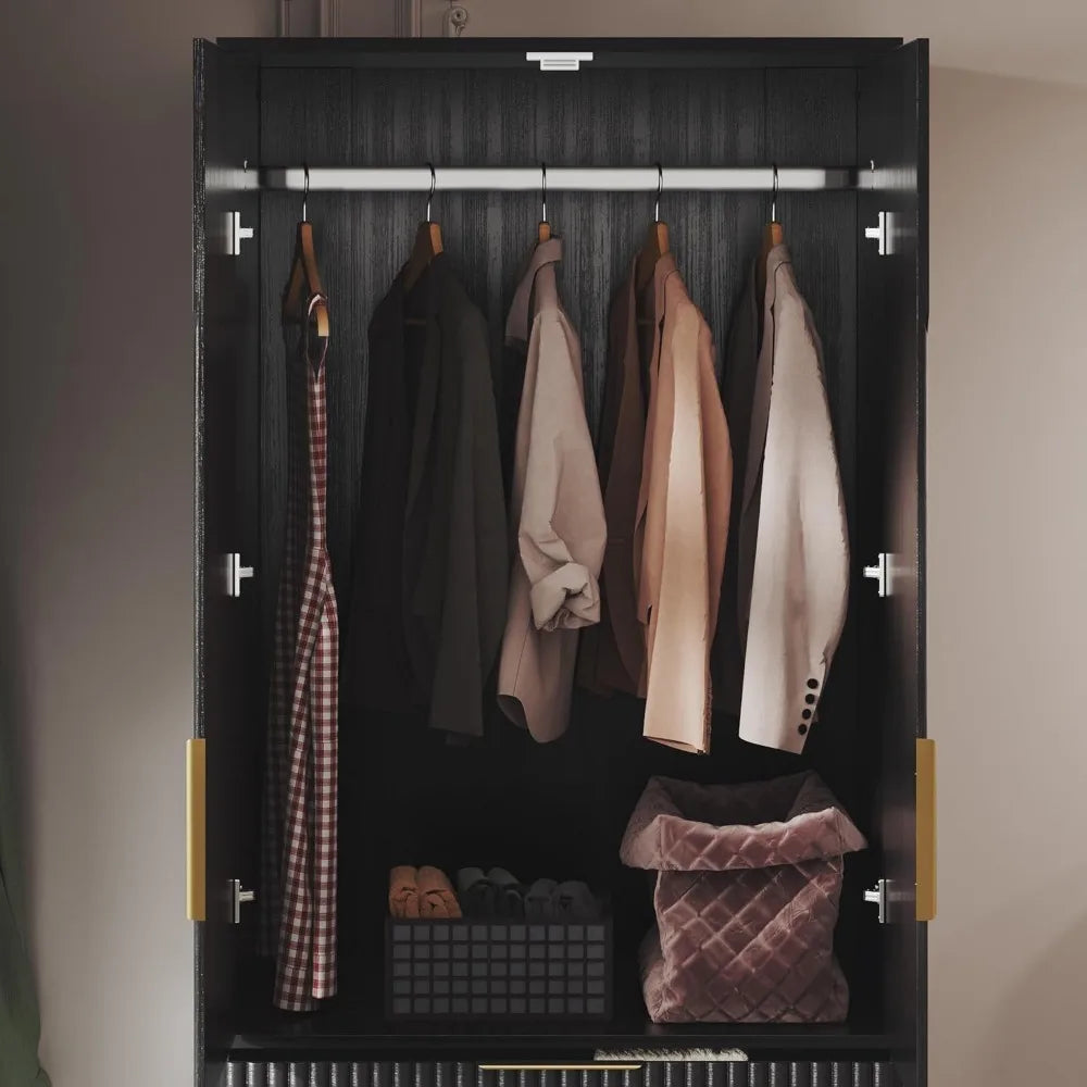 - 【Build to Last】The bedroom wardrobe armoire is made of high-quality MDF wood which ensures stability . And a large, sturdy base supports the entire structure, while a wood frame enhances durability and endurance, promising a long-lasting closet solution for your home. Besides, Its sleek, paint-free surface is water and scratch-resistant, simplifying cleaning and maintenance. what's more, our cabinet doors use cushioned hinges to reduce collisions ensuring the long-term use
