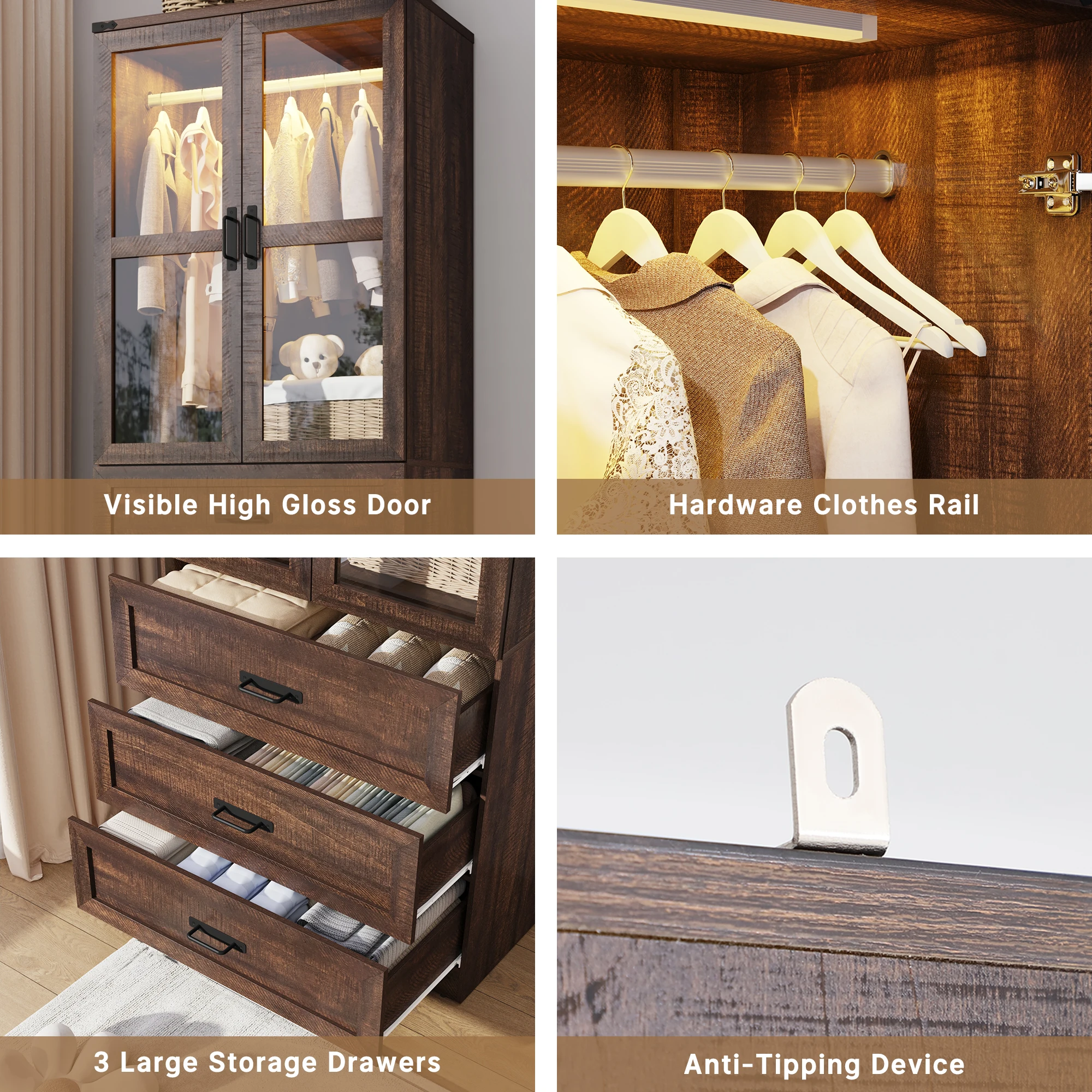 LED Wardrobe Closet:Warm lighting fills your home with a cozy atmosphere.It is convenient for you to find clothes in the dark.this 75" freestanding wooden wardrobe closet cabinet for bedroom Equipped with human body intelligent induction light, the door light turns on when opened and turns off when it is closed the door. The induction range is within 5 meters.