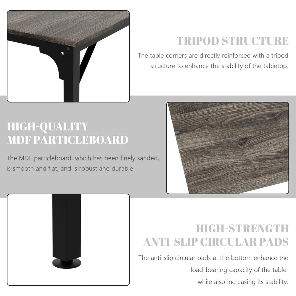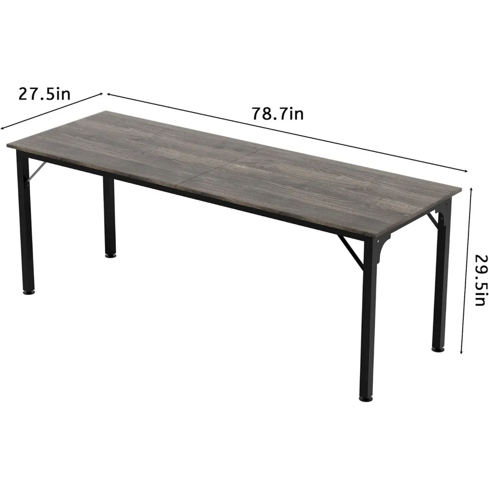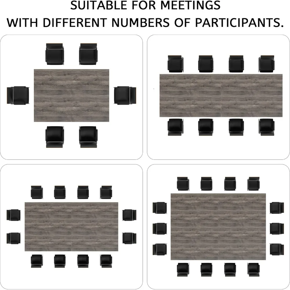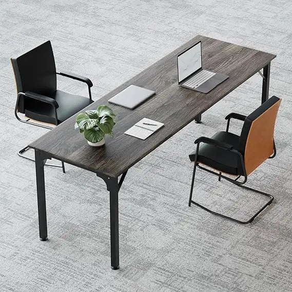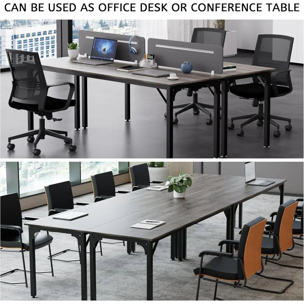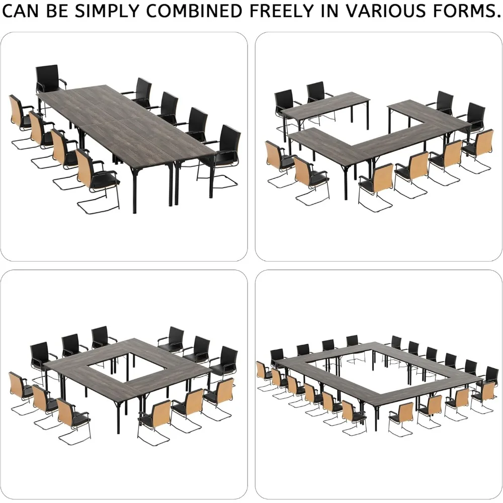 This item features a high-quality tabletop made from thick particleboard with a high-gloss finish, providing a smooth and comfortable surface. The frame is constructed from high-strength metal with a powder-coated finish, ensuring durability and stability. The table's design includes a triangular structure that attaches the tabletop to the frame, significantly enhancing its stability. The legs are equipped with circular footpads made of PP material, which are resistant to bending and impact, effectively reducing wobbling and providing a more stable table than competitors. Each table measures 78.7 inches by 27.5 inches by 29.5 inches, offering ample space for 4-6 people. The tables can be easily assembled in various configurations, whether placed horizontally or vertically, allowing for quick adaptation to different office spaces and the number of participants. The height of the table legs can be adjusted by turning screws at the bottom of the circular pads, ensuring the table remains level even on slightly uneven floors. The seminar table has a simple structure and comes with detailed assembly instructions, making it easy to set up quickly. It is versatile in use, suitable as a regular office desk for everyday work and can be assembled into different conference setups when needed. It's perfect for growing companies seeking flexible solutions and its simple design also makes it suitable for home offices or as a dining table in a cafeteria. The possibilities for use are endless.