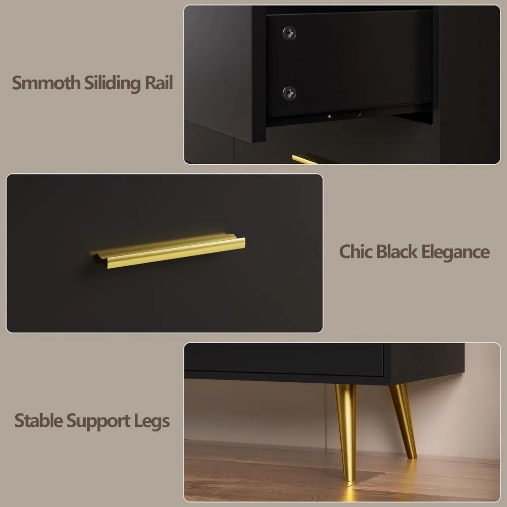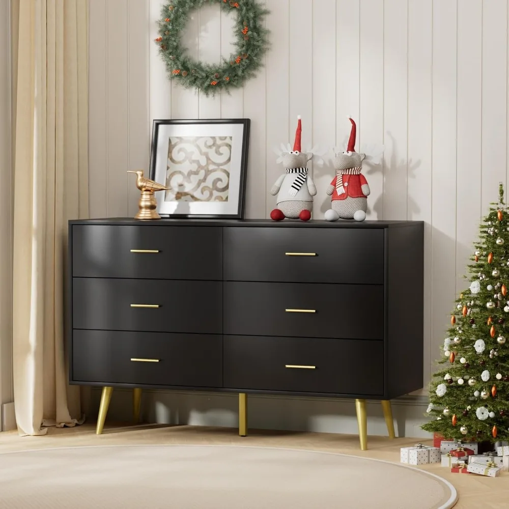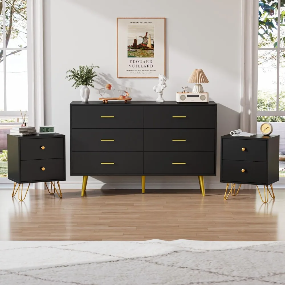 Introducing the Chic Black & Gold Dresser and Nightstand Set, a perfect addition to your bedroom, living room, or hallway. This elegant furniture set features a timeless black and gold design that adds a sophisticated touch to your home decor. With a 6-drawer dresser and two nightstands, this set offers ample storage for your clothes, accessories, and more, measuring 15.75" deep, 47.21" wide, and 30.7" high. Enjoy the convenience of easy assembly with this dresser and nightstand set, designed for quick and hassle-free installation. Pre-drilled holes and clear instructions make setting up a breeze, so you can start enjoying the stylish and functional features right away. The versatile and functional design of this storage set makes it an ideal choice for any room in your home. Its sleek, modern look seamlessly integrates into various settings, providing practical storage solutions while enhancing your space's aesthetic appeal. We are committed to providing top-notch customer service. The Black Dresser and Nightstand Set comes with reliable after-sales support to ensure your satisfaction. Should you have any inquiries or need assistance, our team is always ready to lend a helping hand.