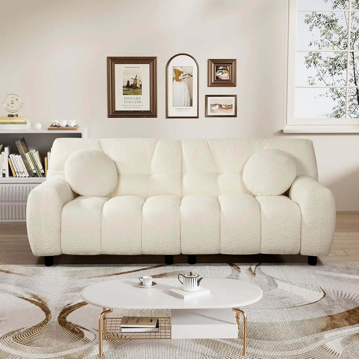 - Stylish Design: Modern cream boucle sofa boasts marshmallow-like curves, elegant lines, and prominent tufted upholstery. Its clean, minimalist yet sophisticated appearance complements modern interior themes, enhancing the overall aesthetic with a luxurious feel