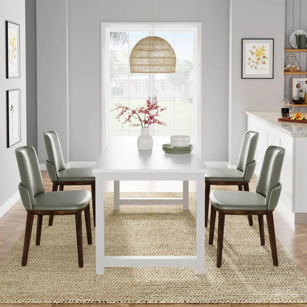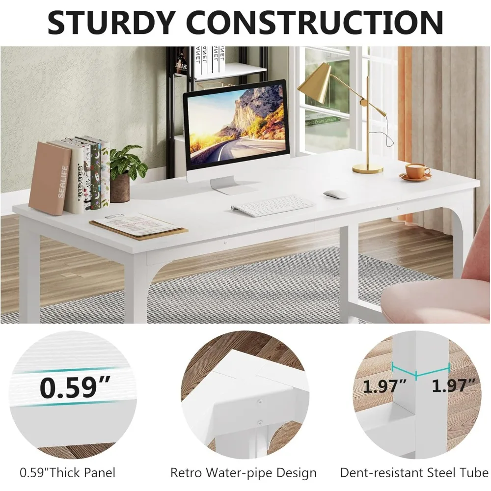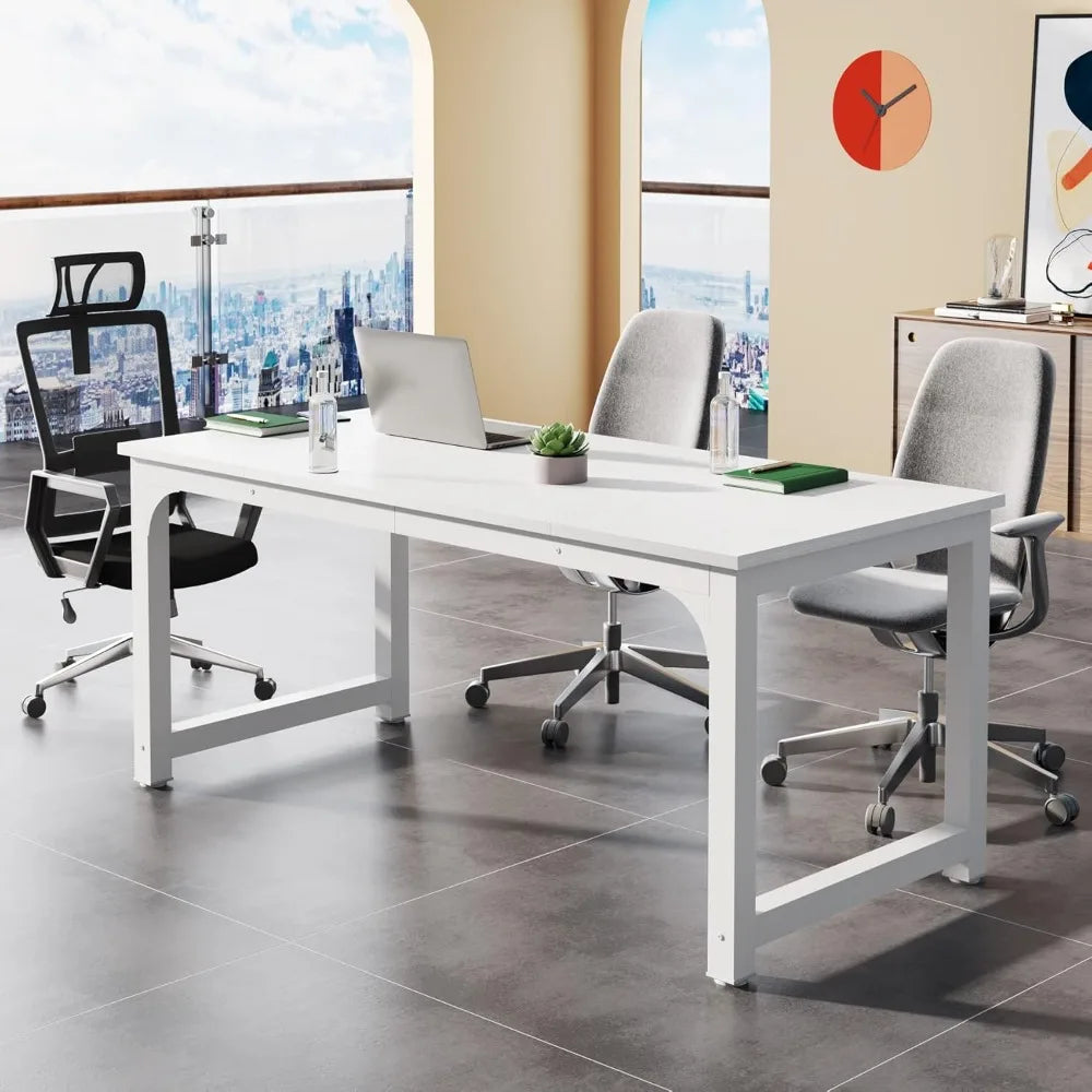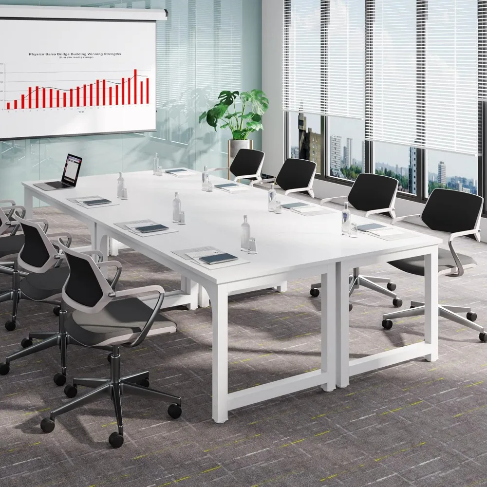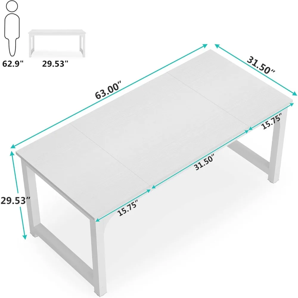 This product is a versatile meeting table designed for small-scale discussions, with dimensions of 63 inches wide by 31.5 inches deep, comfortably seating six people. It offers exceptional stability and an elegant appearance, making it ideal for training areas, meetings, and break rooms without occupying too much space. It's perfect for bringing teams together in both open and private work environments. Beyond being a conference desk, this table's size and style make it a great choice for a large computer desk or executive desk in your home office. It provides ample space for laptops, PCs, keyboards, and other desk accessories compared to other home office desks. Durability is ensured with the use of environment-grade engineered wood, rated E1, which meets world standards for premium furniture. The color-matched veneer is carefully selected, and the table is reinforced with 2-inch by 2-inch thick metal tubes, making it extremely sturdy. A welding triangular design adds extra stability to this computer desk. The desk combines rigid metal with tasteful white splice wooden boards, giving it a contemporary look that complements any room and enhances the space's style and premium feel. The surface is smooth, waterproof, and easy to maintain. Assembly is straightforward, with every piece labeled and a package that includes all necessary hardware, tools, and clear instructions. Should you encounter any issues, our friendly customer service team is always available to assist you.