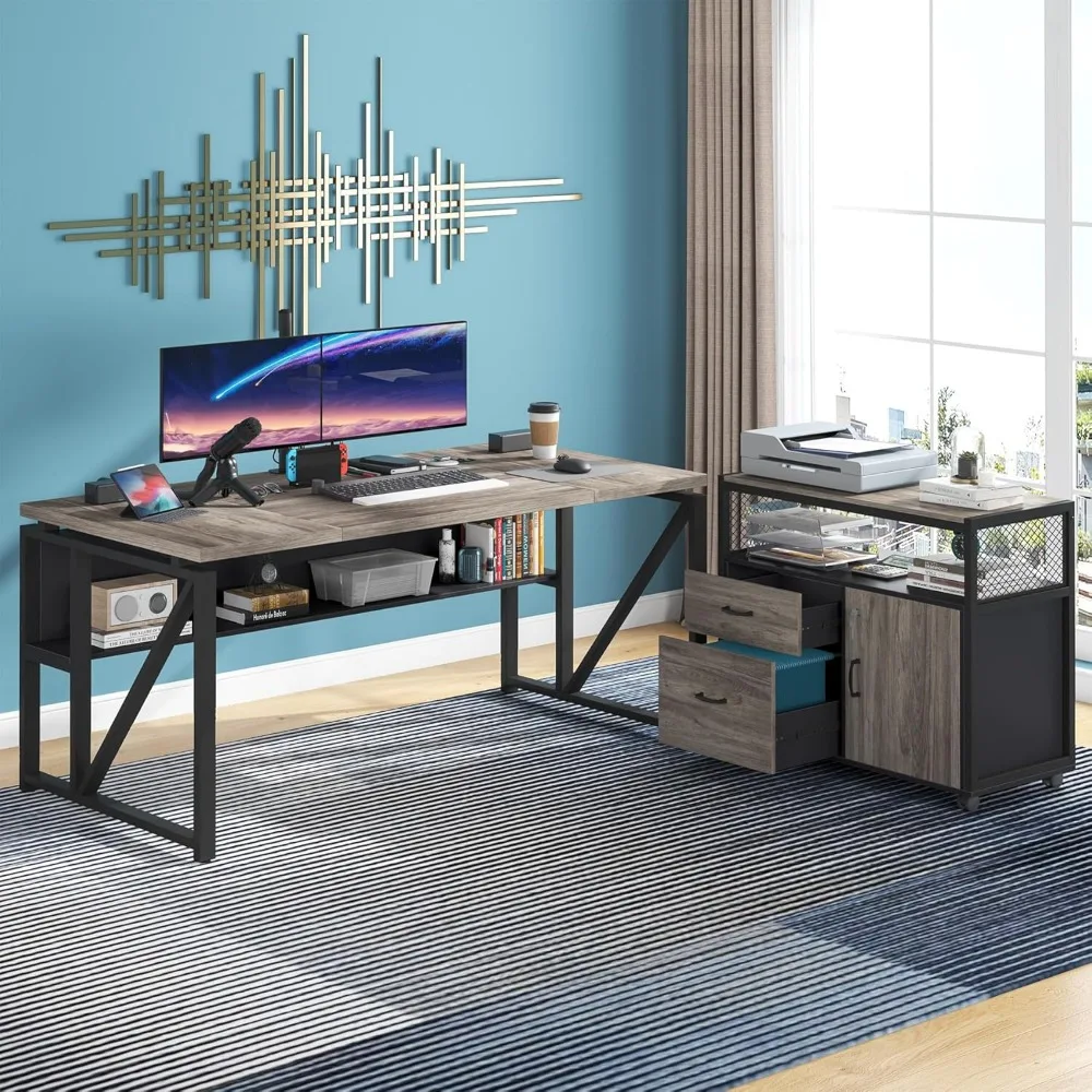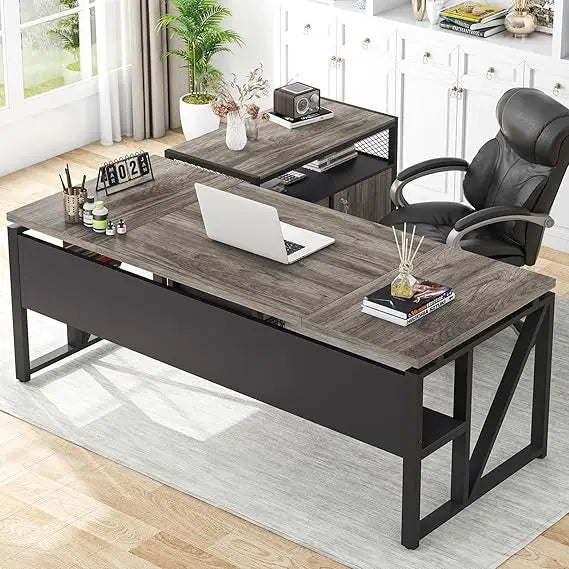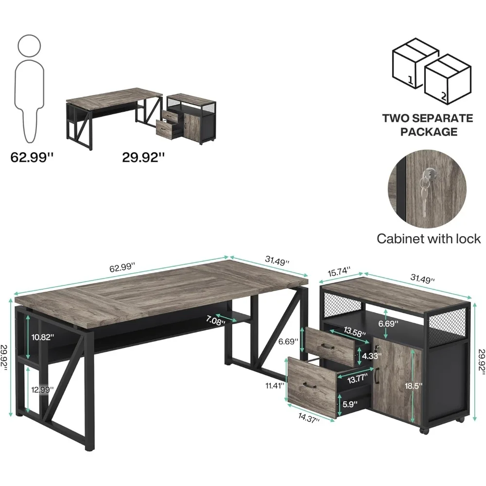 This product offers a freestanding 2-piece home office furniture set, consisting of a 63-inch computer desk and a 32-inch filing cabinet. The design allows for versatile arrangement, either as an L-shaped desk to maximize workspace or separated for a distinct look. The large computer desk measures 63 inches in length, 31 inches in width, and 30 inches in height, providing ample space for a laptop, additional monitor, lamp, and ample writing area. It features a spacious storage shelf beneath the desk surface, perfect for storing books and office supplies. The 32-inch lateral filing cabinet offers mobile office storage with dimensions of 32 inches in length, 16 inches in width, and 30 inches in height. It includes a secondary work surface on the return, ideal for a printer or scanner, and a smaller drawer for office essentials, along with a larger drawer for hanging letter-sized filing folders. There's also a concealed large space for storing larger items, and the cabinet comes with a lock for securing important documents. The office desk is constructed with a heavy-duty metal frame and a 1.2-inch thick compressed board, ensuring both durability and stability. The furniture set is finished in a vintage color scheme combined with black, making it suitable for any decor style. Assembly is straightforward, with all necessary hardware, tools, and clear instructions included. Please note that the desk and cabinet will be shipped in two separate parcels.