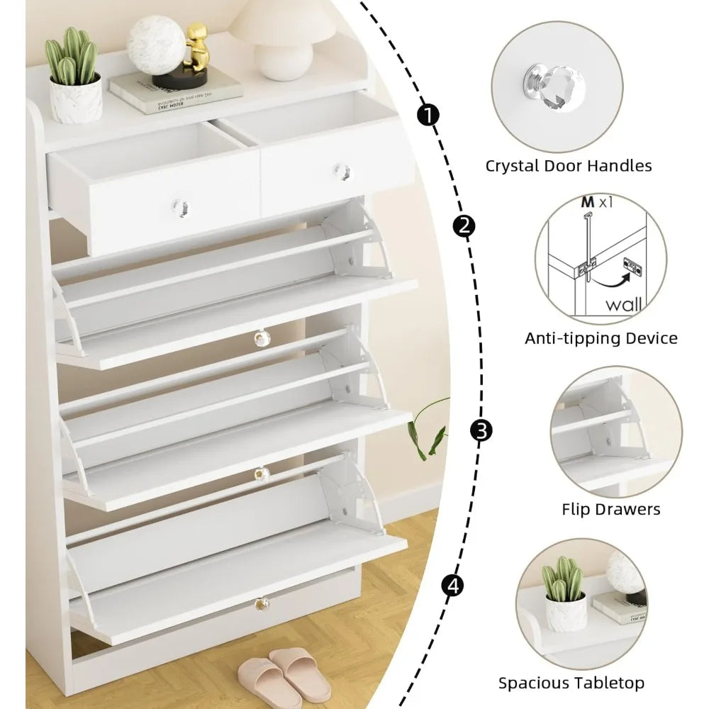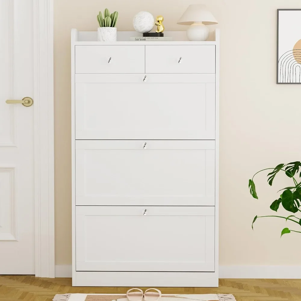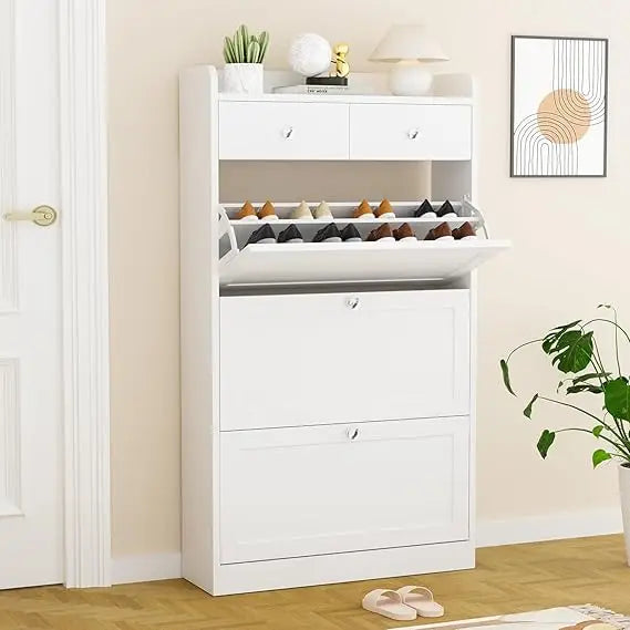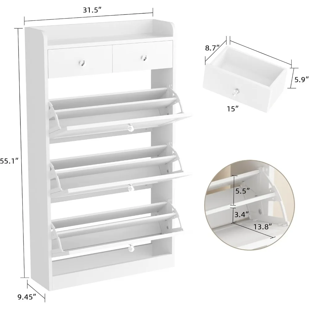 This shoe cabinet offers a large storage capacity with three adjustable flip drawers, perfect for various shoe types and additional compartments for storing items like keys and wallets near the door. Its slim, vertical design conserves space, measuring 31.5 inches wide, 9.4 inches deep, and 55.1 inches high, and it complements any home decor. Constructed from durable MDF and metal parts, the cabinet boasts a sturdy structure with good load-bearing capabilities, and features a sleek crystal handle for easy drawer operation. The practical pull-down drawer design is user-friendly, and a safety feature prevents tipping, making it safe for households with children and pets. Assembly is straightforward with all necessary parts and instructions included, and customer support is available for any assembly queries.