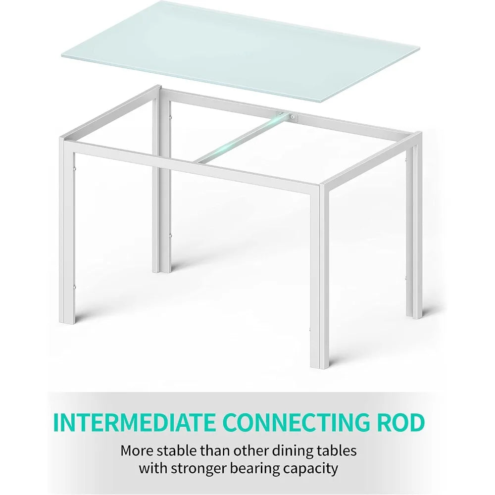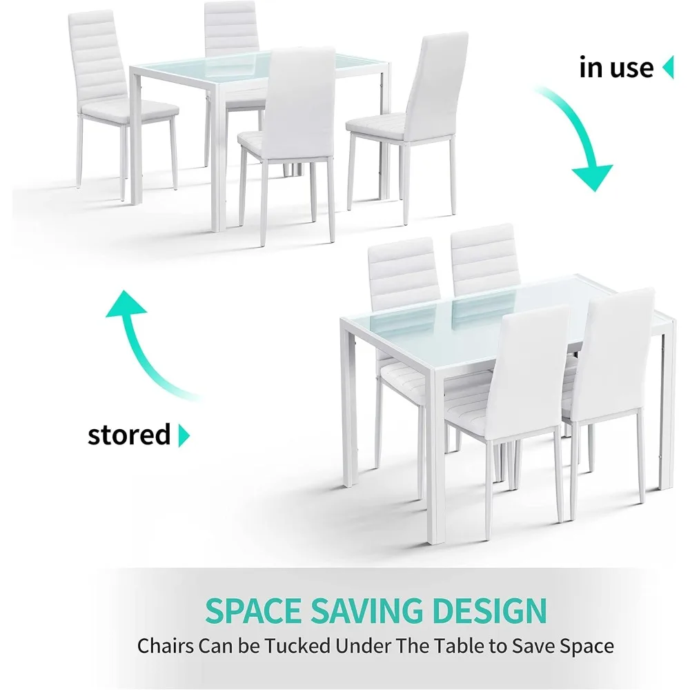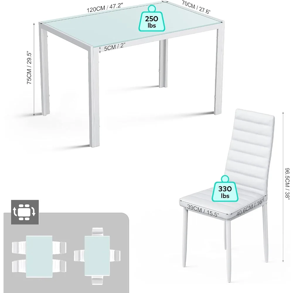 This 5-piece dining set is designed for durability and style, featuring a sleek fiberglass table top supported by a robust iron frame. The modern and sophisticated design enhances the aesthetic of any dining space. The table's glass surface is easy to maintain, allowing for quick cleanups after spills with just a wipe of clean water, ensuring it remains pristine. The set includes four cushioned chairs with a streamlined backrest that conforms to the natural curve of your spine, providing comfort and support with soft foam padding and PU leather upholstery. The versatile design of the table and chairs makes it suitable for various decor styles and can be used in dining rooms, kitchens, or living rooms, perfect for family meals and social gatherings. The table dimensions are L47.2" x W27.6" x H29.5", and each chair measures H38.2" x W19.7" x L16.1". The chairs can be easily tucked under the table after use, making this set space-efficient and ideal for apartments or smaller dining areas.