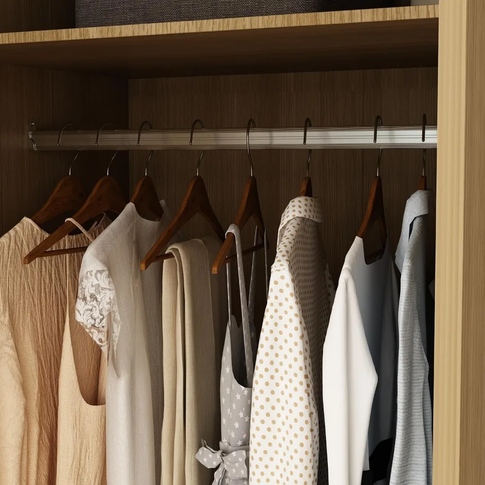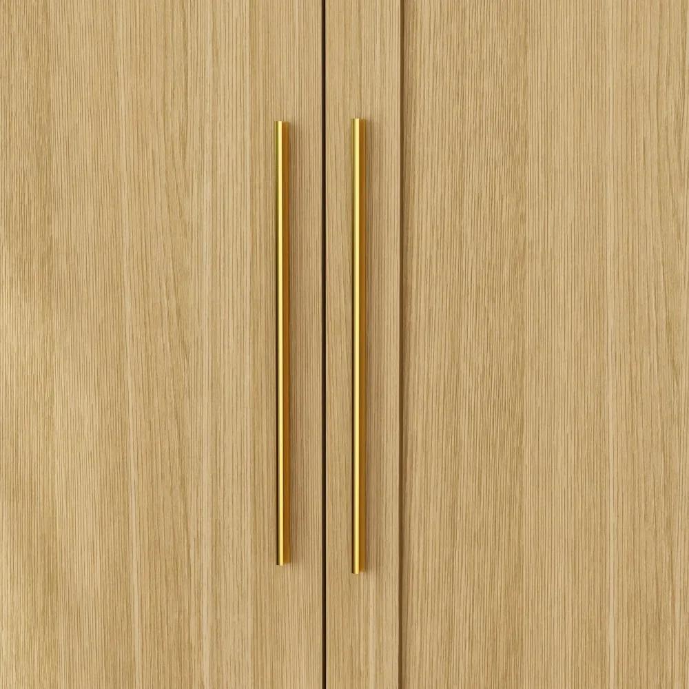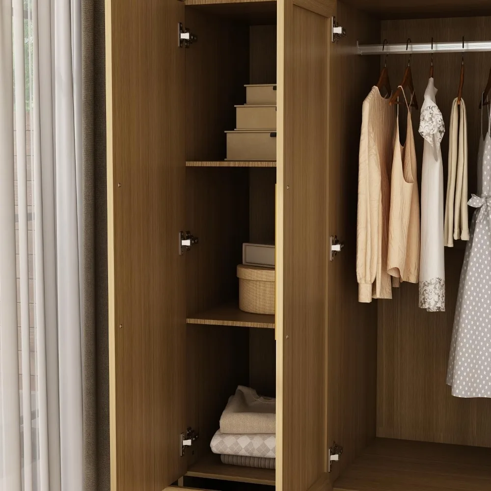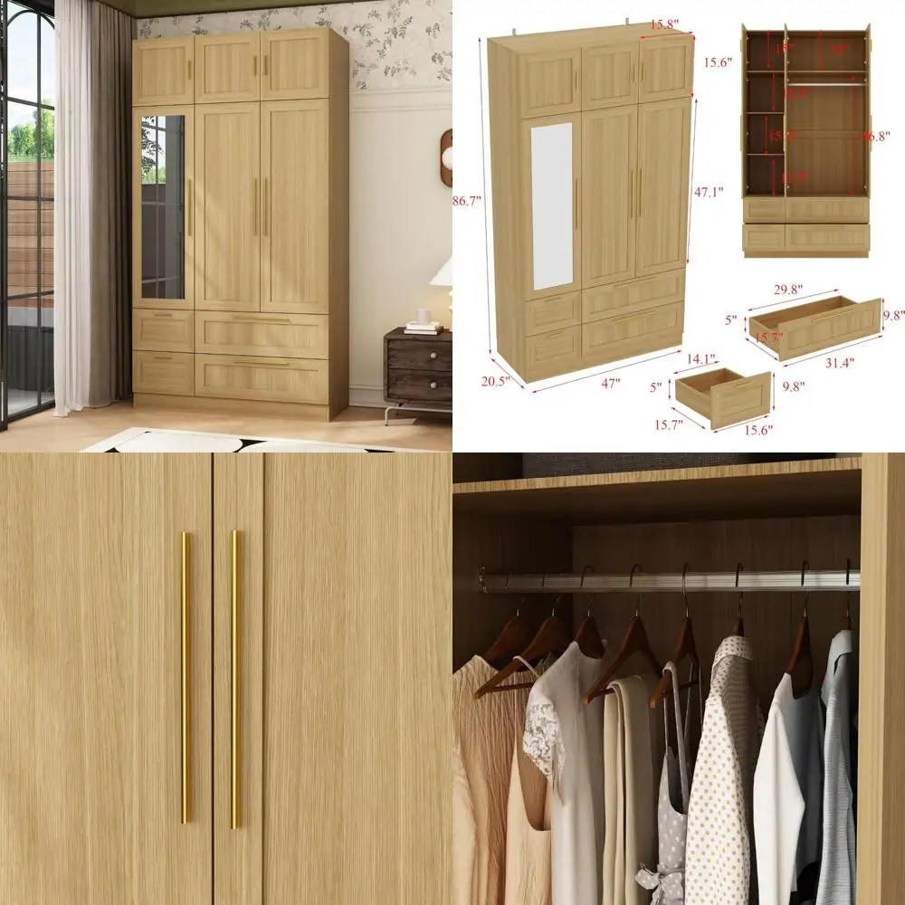 This wardrobe with a mirror is perfect for your bedroom or cloakroom. It has a high-definition mirror on the door, making it easy to check your appearance and makeup. The wardrobe offers ample storage space with a long and sturdy hanging rod for dresses, suits, and coats, as well as 4 drawers and shelves for folded clothes, bedding, bags, and accessories. Designed with a modern touch, the oak wardrobe features gold handles and rectangular frame patterns on doors and drawer fronts, adding geometric beauty and a sleek look to any room. Measuring 20.5 inches deep, 47 inches wide, and 86.7 inches high, it's crafted from durable MDF for long-lasting use and stability. It comes with anti-tipping devices and smooth slide rails for easy-glide drawers. Assembly is straightforward with clear instructions and necessary hardware included in two separate packages, which may arrive at different times. Please ensure all parts are received before starting the assembly process.