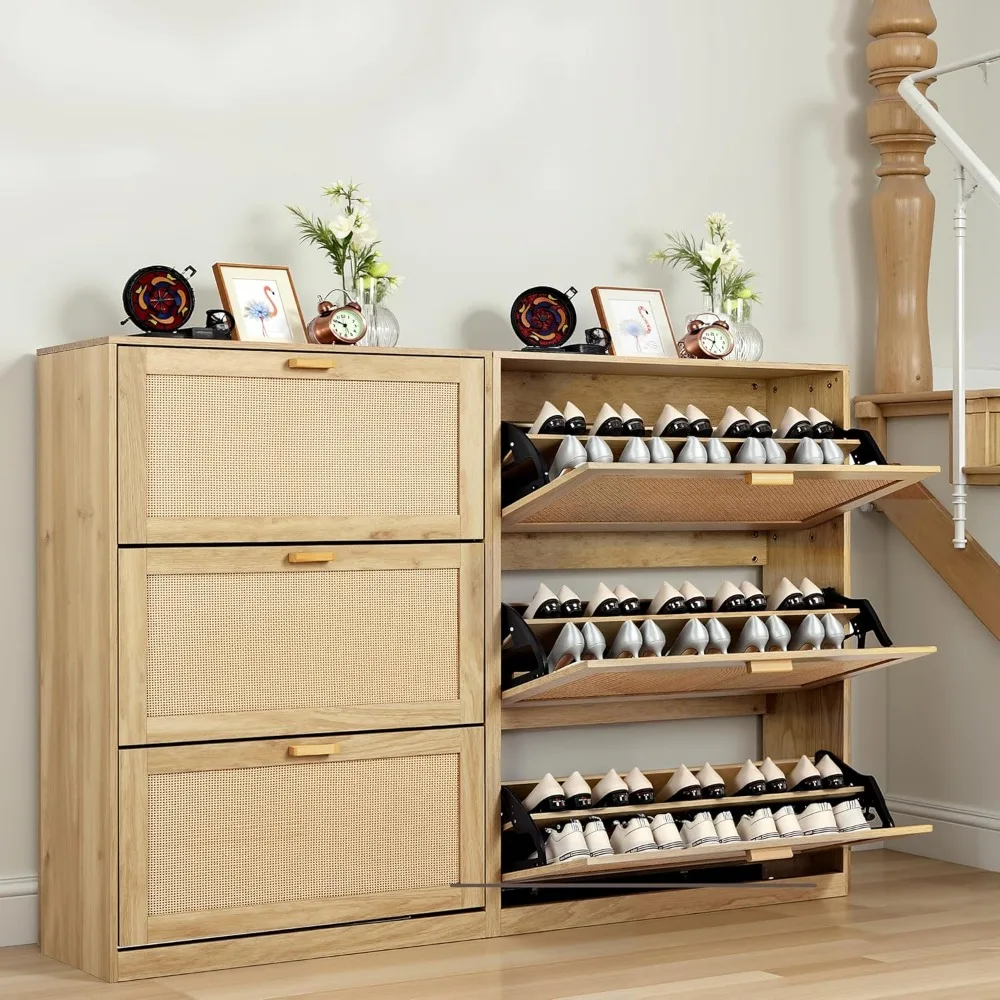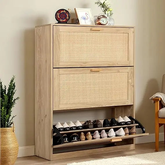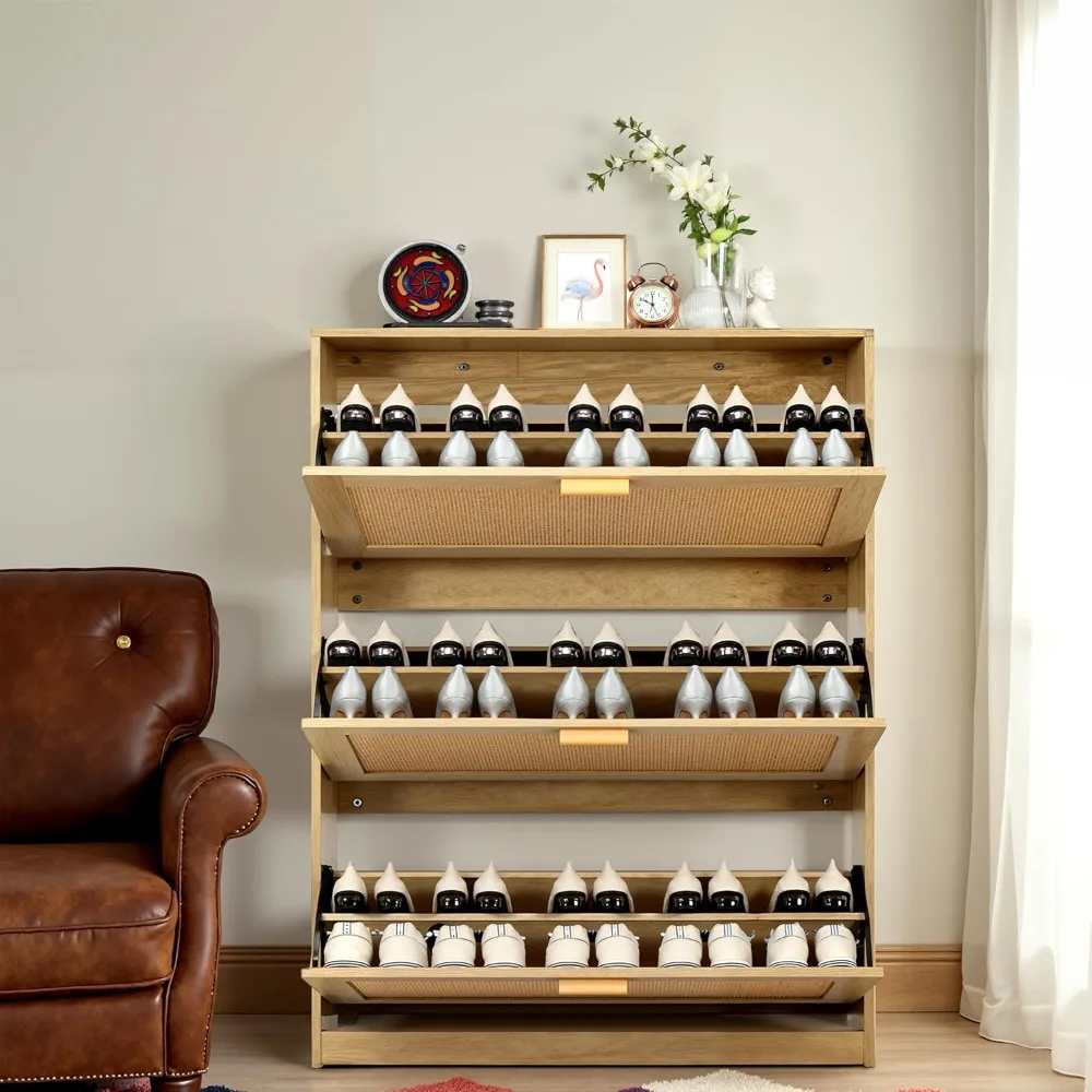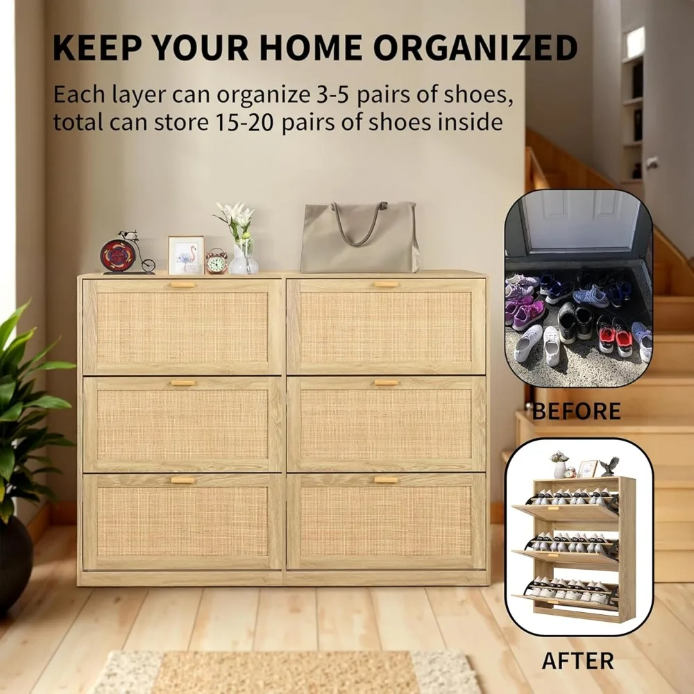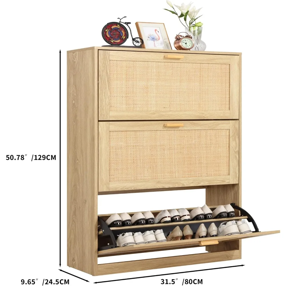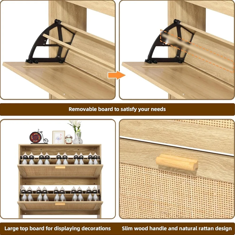 Here is a rewritten product description based on the provided information: --- Discover our spacious shoe cabinet, designed with an extended length and increased tier distance to accommodate more shoes efficiently. Measuring 31.5 inches in length, 9.65 inches in width, and 50.78 inches in height, this cabinet is perfect for storing large shoe sizes with each flip door boasting a 15-inch height. Blending natural elements with modern design, our shoe cabinet features rattan-decorated doors that not only offer aesthetic appeal but also practical benefits. The natural rattan is hand-woven, providing moisture and heat absorption while complementing various home decor styles. Ideal for placement in hallways, entryways, living rooms, or any preferred space. Enjoy the flexibility of adjustable and removable compartments within each flip drawer, allowing you to fit shoes of varying heights neatly. The top surface serves as a multi-functional storage area for items like keys, umbrellas, small plants, and decorative displays. Constructed with eco-friendly and premium MDF board, our shoe cabinet promises durability and a smooth, easy-to-clean surface that resists water and scratches, ensuring a long-lasting piece of furniture. Assembly is a breeze with our clear instructions, complete with illustrations and labeled parts. All screws are organized in separate bags, and each component is marked for quick and successful installation. Should you encounter any issues during assembly, reach out to us, and we guarantee a response within 24 hours. --- This description maintains the original meaning while rephrasing the content and omitting special characters.