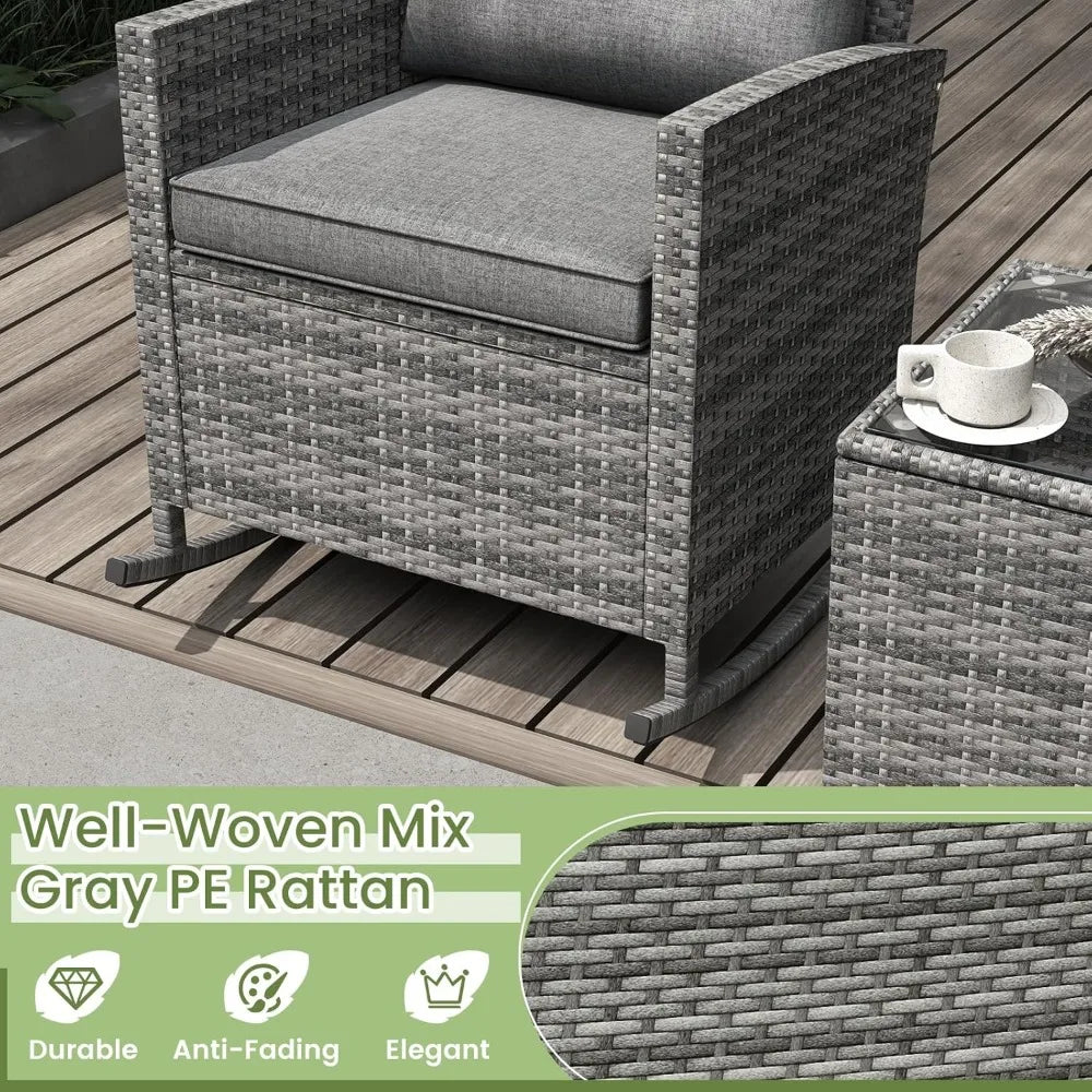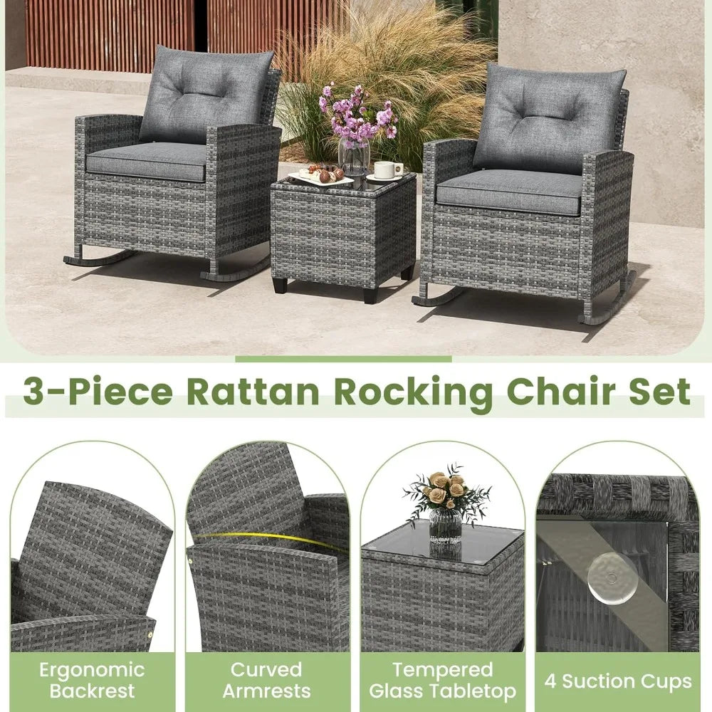 This wicker rocking chair set is designed for a serene rocking experience, perfect for relaxing or enjoying a morning coffee. The 3-piece rattan patio set is versatile, suitable for both leisure and entertaining guests in your outdoor space. Made from premium PE rattan, this high-quality bistro set is durable and resistant to fading, ensuring long-lasting enjoyment. The set includes thickly padded cushions on the wicker chairs, with easy-to-zip covers that are both clean and pet-friendly, providing ultimate comfort. The tempered glass coffee table offers ample space for drinks, snacks, or decor, and is easy to clean. This stylish and inviting patio set can be used in gardens, balconies, poolside, or living rooms, blending casual luxury with functionality and aesthetic appeal. Assembly is straightforward, requiring only the tightening of screws to secure the pieces. Each chair measures 26 inches wide by 31.5 inches deep by 31.5 inches high, with a weight capacity of 400 lbs. The coffee table measures 18 inches long by 18 inches wide by 18 inches high and has a weight capacity of 100 lbs.