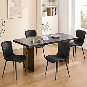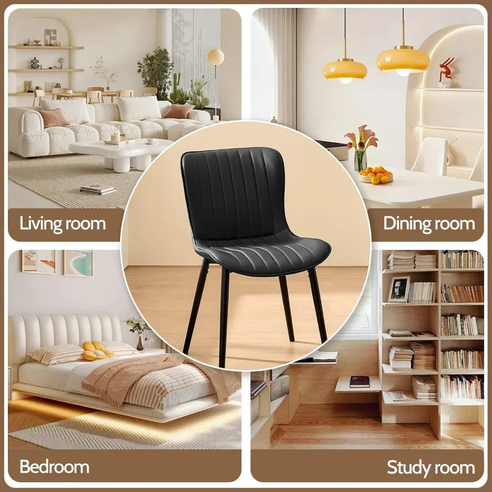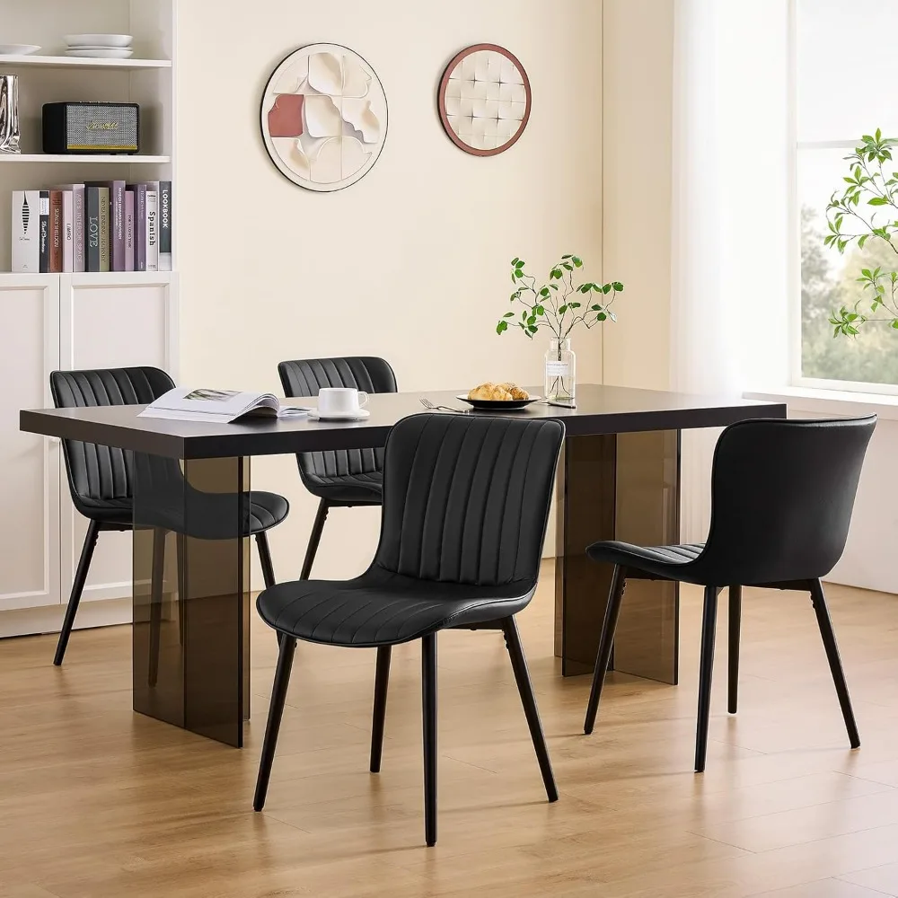 This product listing features a set of four black dining chairs that embody a contemporary and stylish design. Their classic black color and metal legs add a touch of sophistication to any dining room, kitchen, or living space, making them a perfect match for various home decor styles. The chairs are designed for comfort, with high-density, thickened sponge cushions and soft PU leather upholstery that provide exceptional comfort for extended periods of sitting. This makes them ideal for daily meals and social gatherings. Constructed with premium, wear-resistant PU leather, these chairs are not only easy to clean but also boast a sturdy wood and metal frame that can support up to 300 lbs. The modern dining chairs come equipped with adjustable feet to protect your floors and ensure stability on any surface. These dining chairs are versatile, suitable for use in the kitchen, dining room, living room, office, or reception areas. They are easy to move and space-saving, making them a stylish and practical addition to any room. Assembly is a breeze with all the necessary tools and clear instructions provided for a quick setup in just three steps, taking only about five minutes. Should you have any questions or need assistance, our support team is available 24/7 to help.