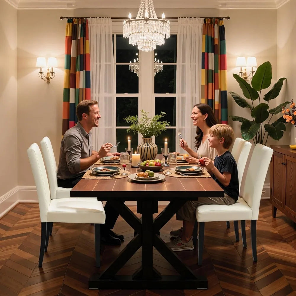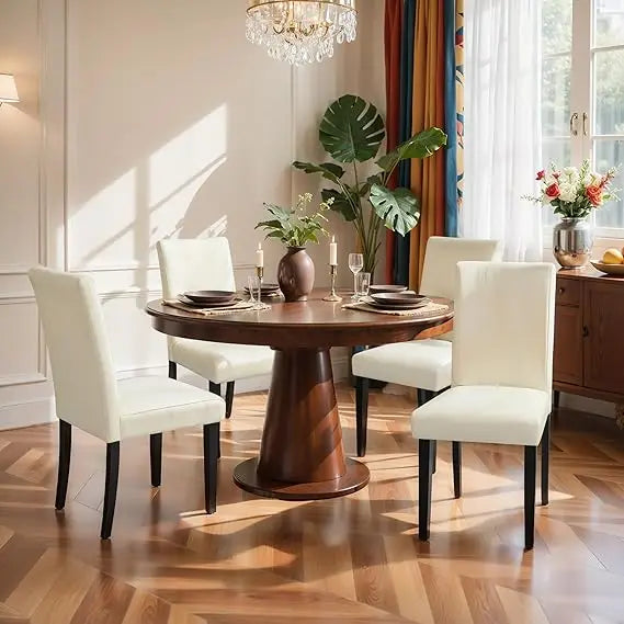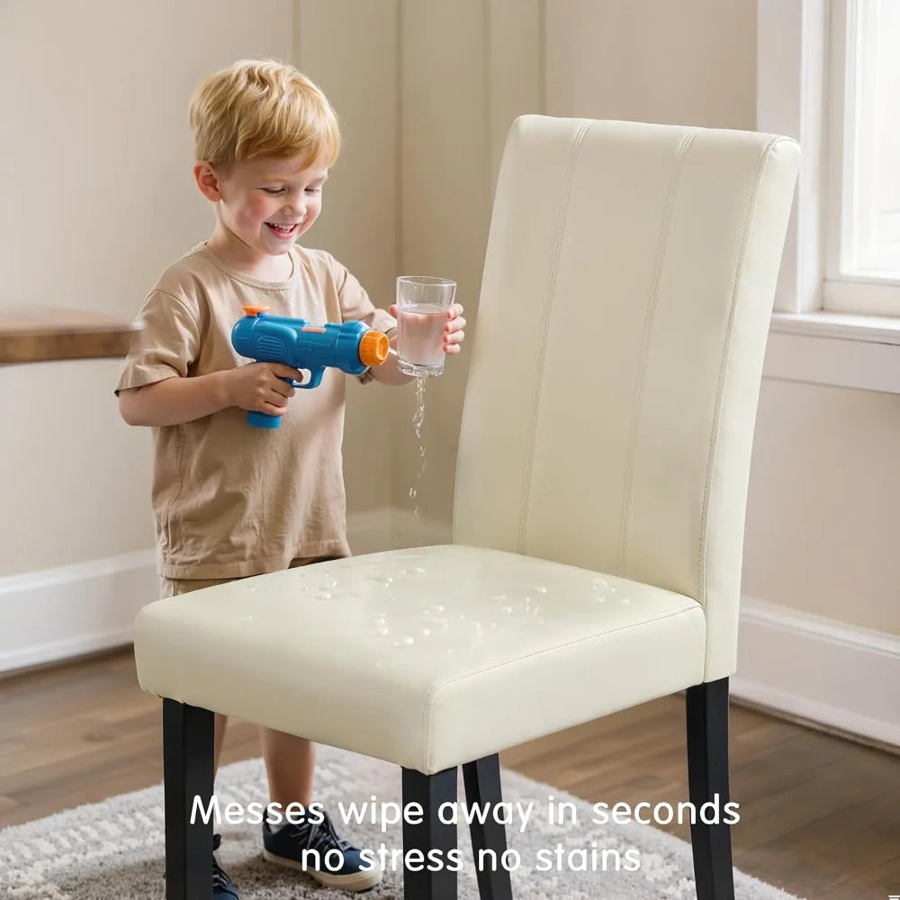 This high-back dining chair is designed with ergonomics in mind, providing superior support for your back and spine to ensure comfort and relaxation. The chair is upholstered in premium PU fabric, which is both elegant and durable, offering resistance to wear and stains while being easy to maintain. The cushioning is made from high-resilience foam, striking a balance between softness and support for long-lasting comfort. The chair's construction is solid and sturdy, featuring premium wooden legs and reinforced joints secured with heavy-duty screws. It also includes adjustable foot caps on the front legs for stability on various surfaces. Assembly is quick and straightforward, with clear instructions, premium hardware, and necessary tools provided for a hassle-free setup.