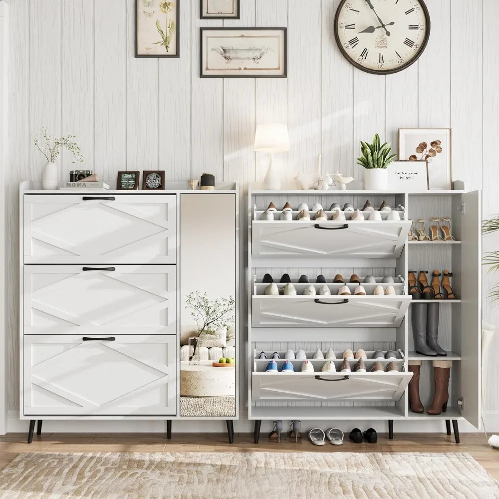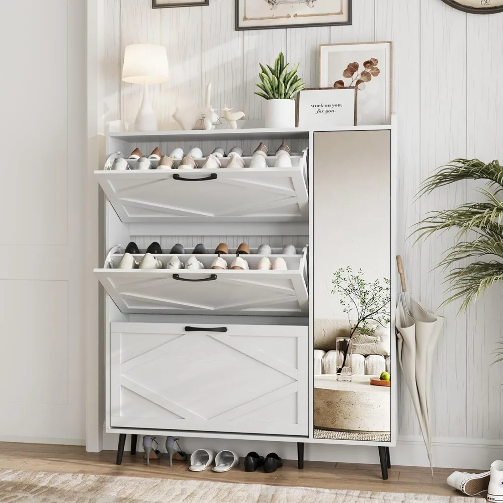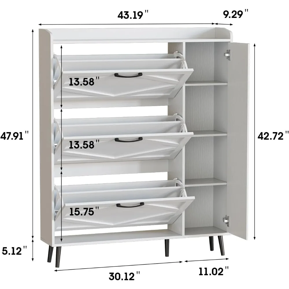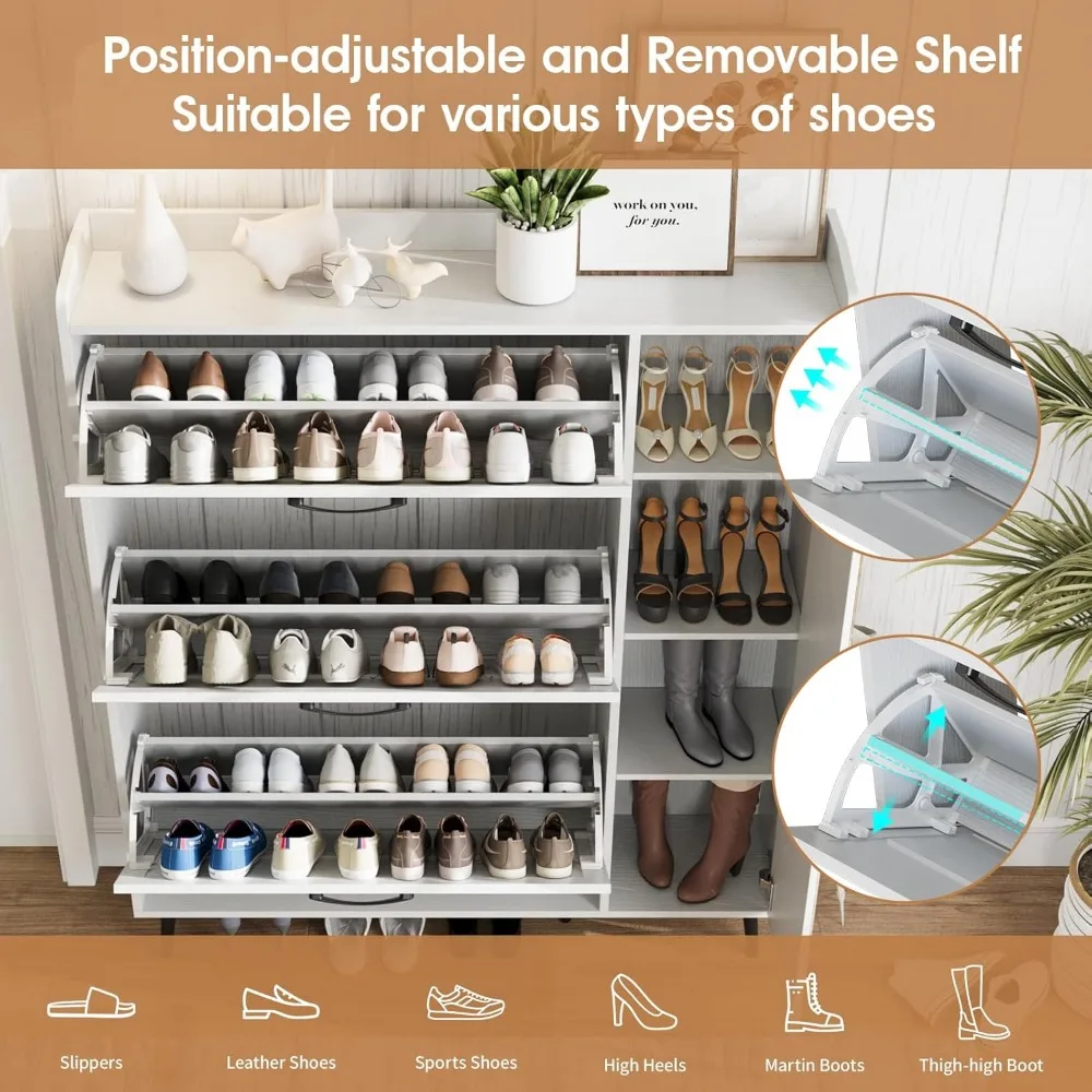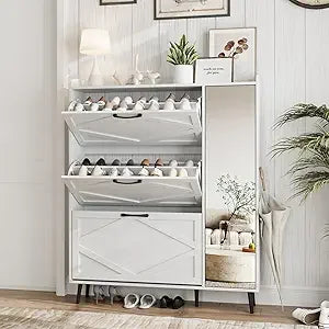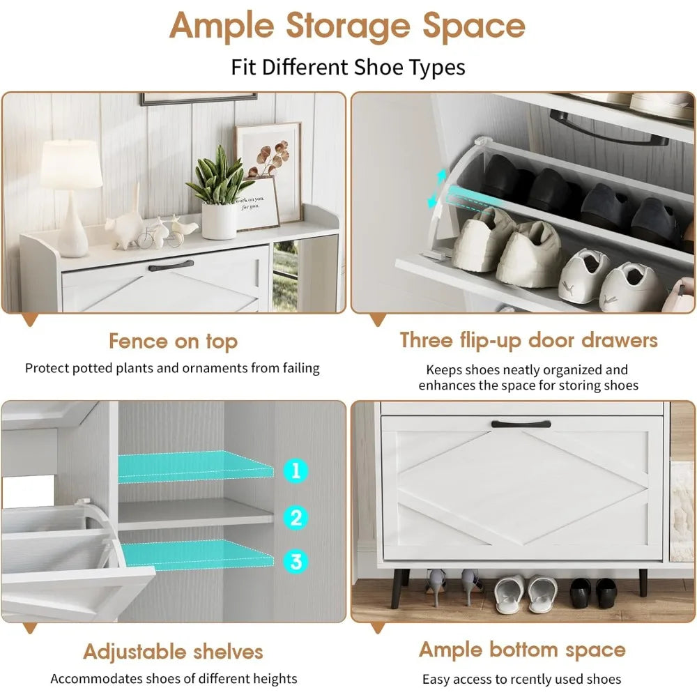 - 【Flip Drawers Shoe Organizer】Compact yet spacious, this shoe storage cabinet is designed to optimize storage in limited areas. You can put it in the entryway, Hallway, living room or other narrow locations. The hidden tipping bucket design efficiently houses numerous shoes, and safeguard shoes from dust and unwanted attention from pets and bugs.