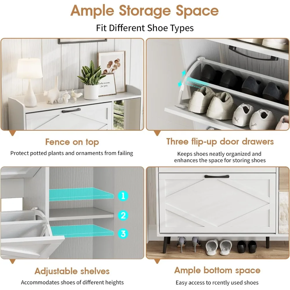 - 【Large Capacity】This shoe cabinet with three drawers and a cabinet, each drawer contains two layers of storage space. The panels and dividers can be adjusted or removed to accommodate different heights and sizes of flats, boots or heels! There is a fence on the top, ideal for placing potted plants, ornaments and keys, without worrying about falling. Additionally, the bottom adds extra space for slippers or sweeping robots storage.