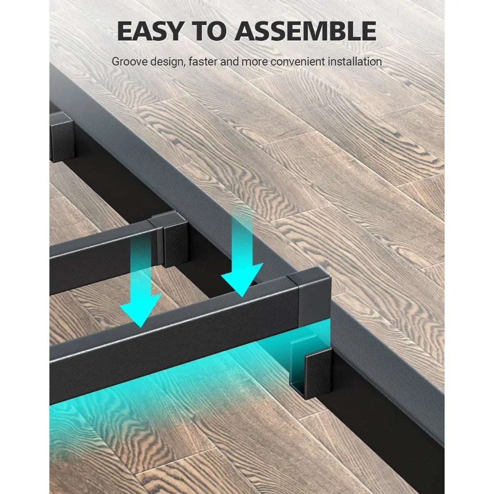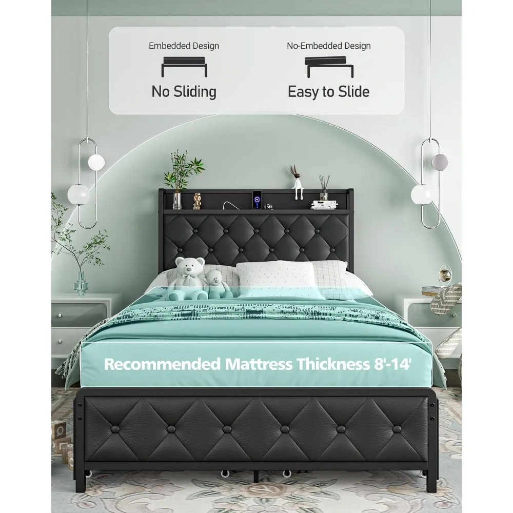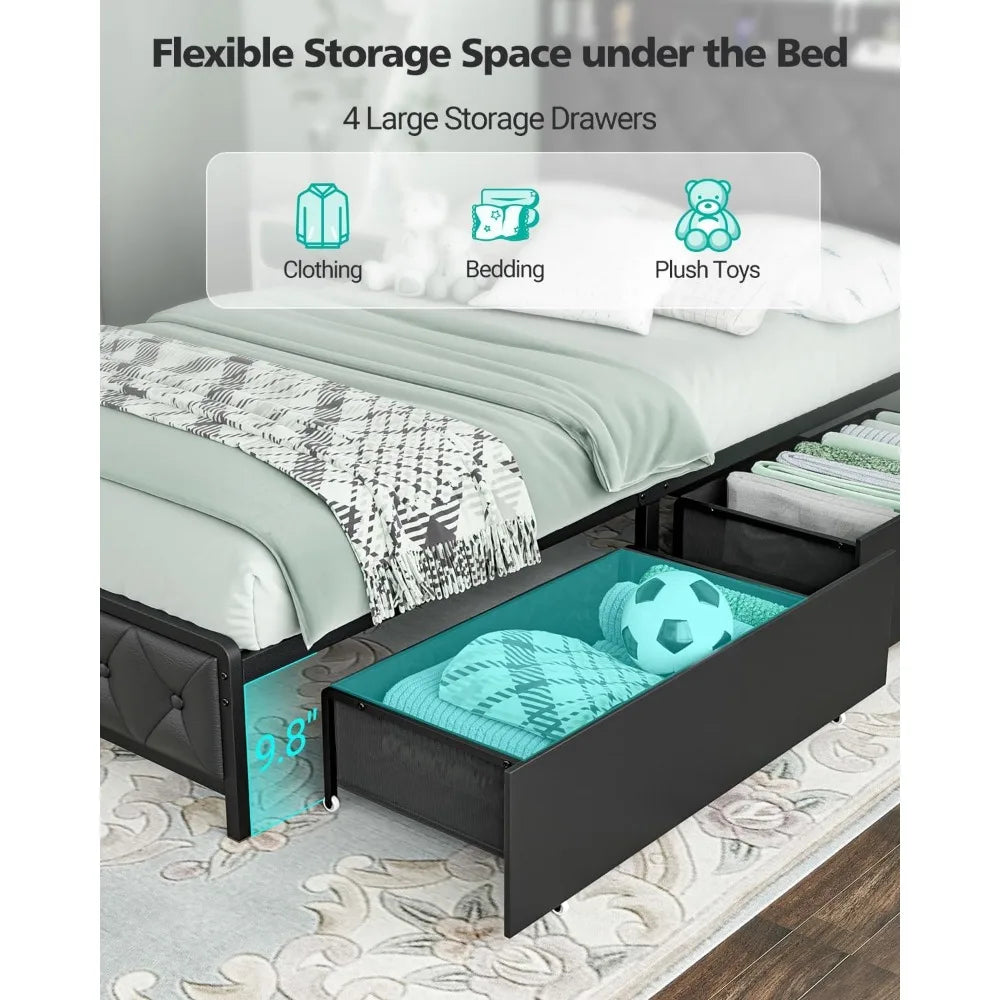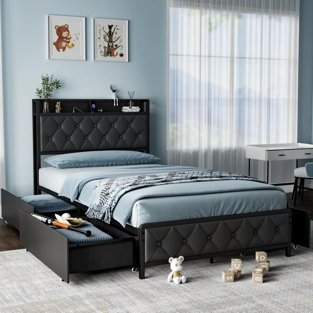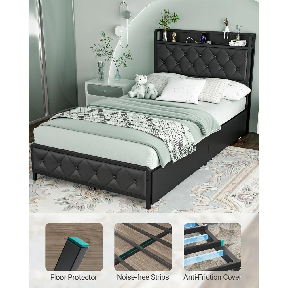 This twin bed frame set features a multifunctional upholstered headboard wrapped in high-quality PU leather. It includes a built-in charging station with two AC outlets, one USB port, and one Type-C port for convenient access. The frame offers a 5.7-inch wide storage space for everyday items like books, phones, and cameras. The twin size bed frame with storage comes with four side-opening drawers, designed for easy push-and-pull access and equipped with a locking mechanism. This provides a convenient storage solution for sheets, clothing, and socks, making it an ideal space-saving feature for kids' rooms or guest rooms. Constructed from high-quality metal, the black twin bed frame ensures sturdy and stable support without the need for a box spring. Assembly is straightforward, with parts easily sequenced by following labels, allowing one person to complete the assembly with ease. The bed frame is designed for a noise-free and comfortable sleep experience, utilizing a snap-in noise-reducing fastener that minimizes friction between the slats and the frame. It also features cushioned feet to protect your floors from scratches. Each twin bed frame comes with a complete package, including all assembly parts, an Instruction Manual, and power outlets. If you have any dissatisfaction, our customer service is committed to responding within 12 hours to address your concerns.