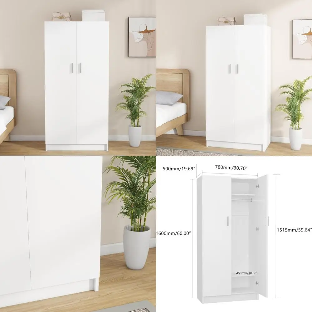 This wardrobe closet, featuring generous dimensions of 19.7 inches deep by 30.7 inches wide by 63 inches high, provides ample storage space for a wide array of clothing, linens, and household items. It includes a hanging rod and two shelves, offering versatile storage solutions to meet your needs. Made from high-quality MDF, this armoire boasts sturdy construction for long-lasting durability and stability, making it a reliable addition to your bedroom or closet. Its classic white color and simple design easily complement various bedroom decors, with a neutral color scheme and clean lines for seamless integration into any space. The built-in hanging rail is ideal for keeping your clothes wrinkle-free and easily accessible, a key feature for organized storage. The wardrobe comes with clear assembly instructions and all necessary hardware for a quick and easy setup process, allowing you to enjoy this stylish and functional storage solution in no time.