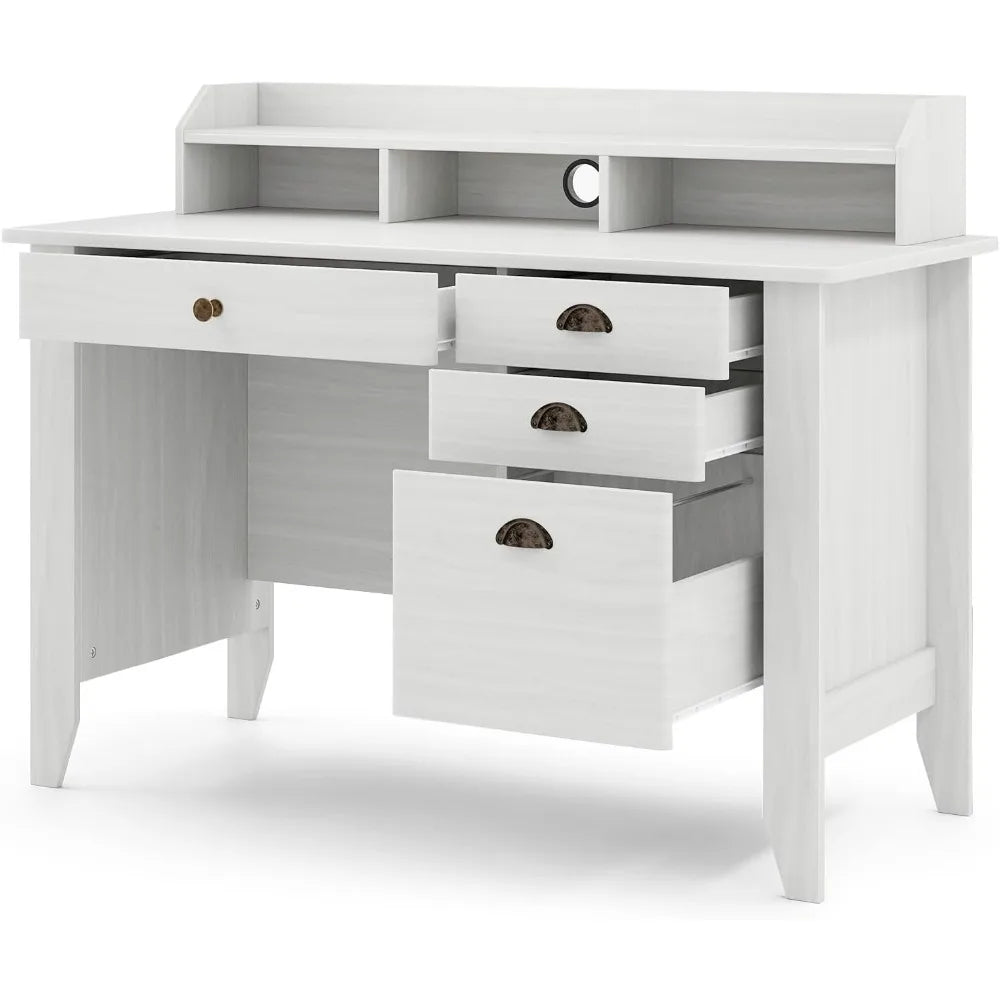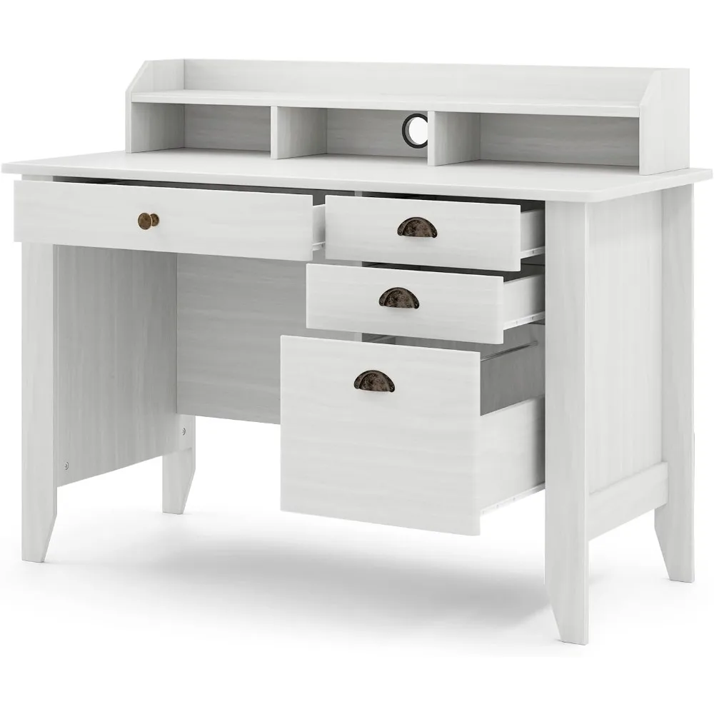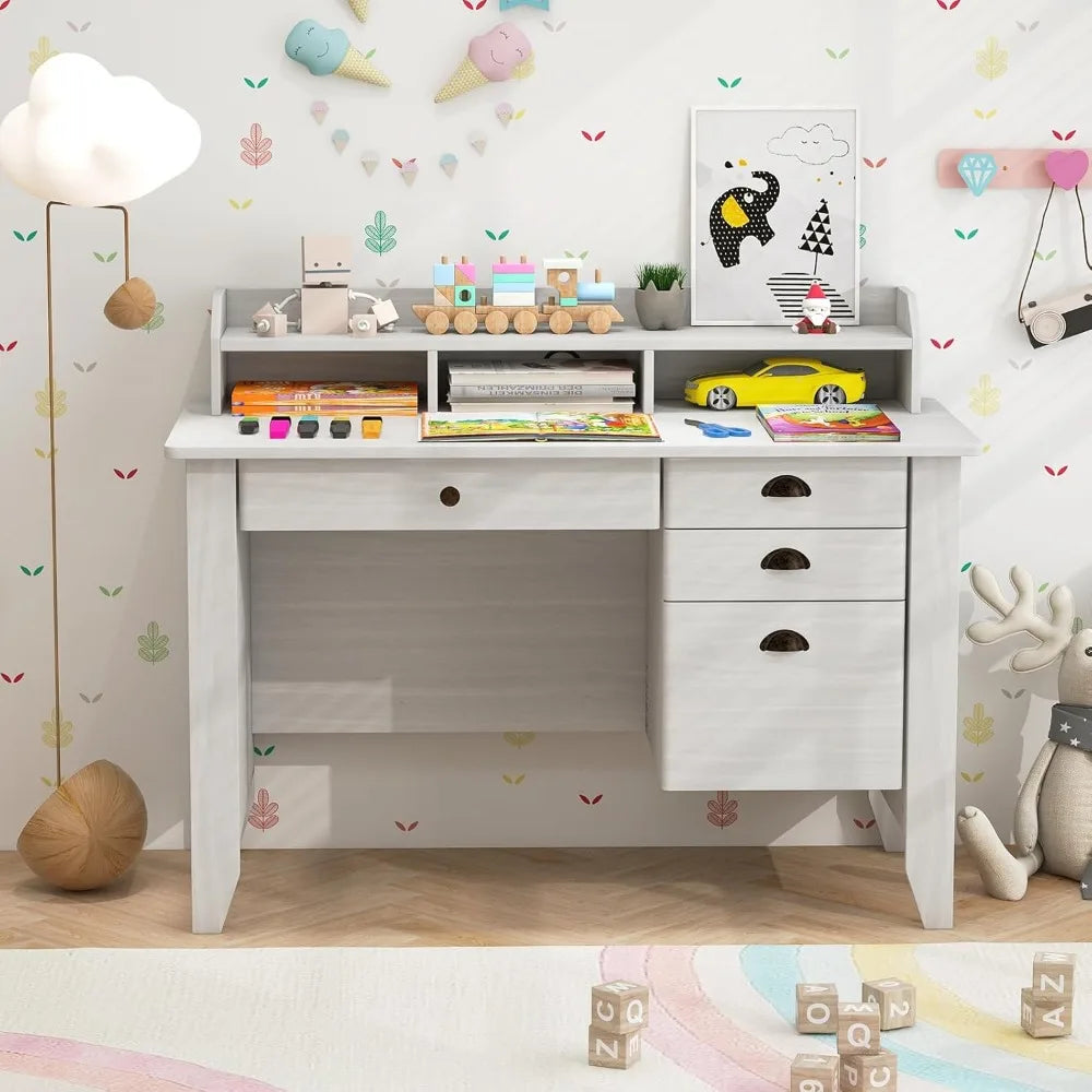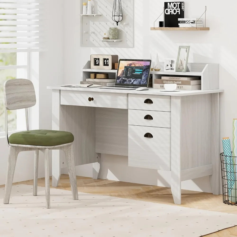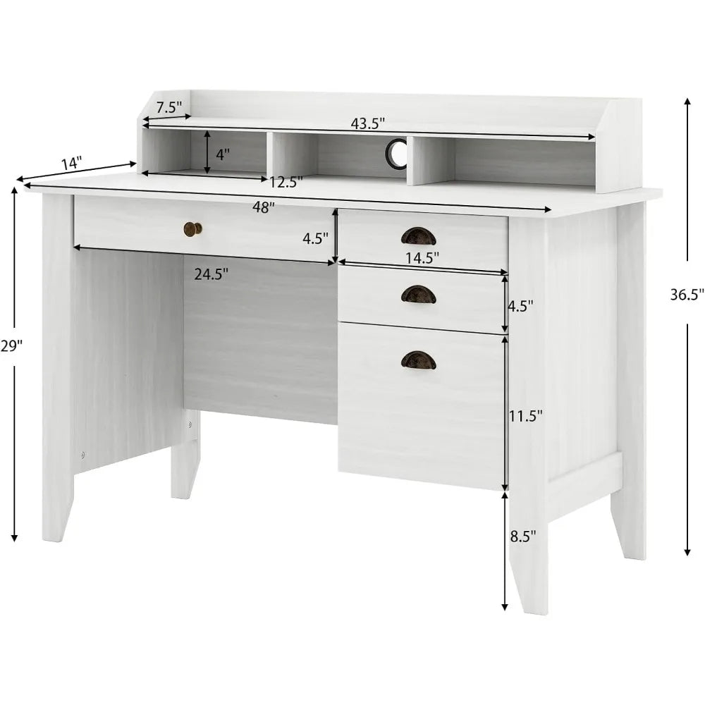 This item is a versatile computer desk designed to meet your various work or study needs. It features a generous tabletop space and comes equipped with four drawers for ample storage. The dimensions of the desk are 22 inches deep, 48 inches wide, and 36.5 inches high. The bottom drawer is specially designed to accommodate letter-sized files and includes hanging rods for convenient access. Additionally, the desk is fitted with a monitor stand and a cable hole to help you keep your screen and wires neatly organized. Constructed from high-quality MDF boards, the desk is both sturdy and scratch-resistant. It is easy to assemble and maintain, making it suitable for use as a computer desk, writing desk, gaming desk, or workstation.