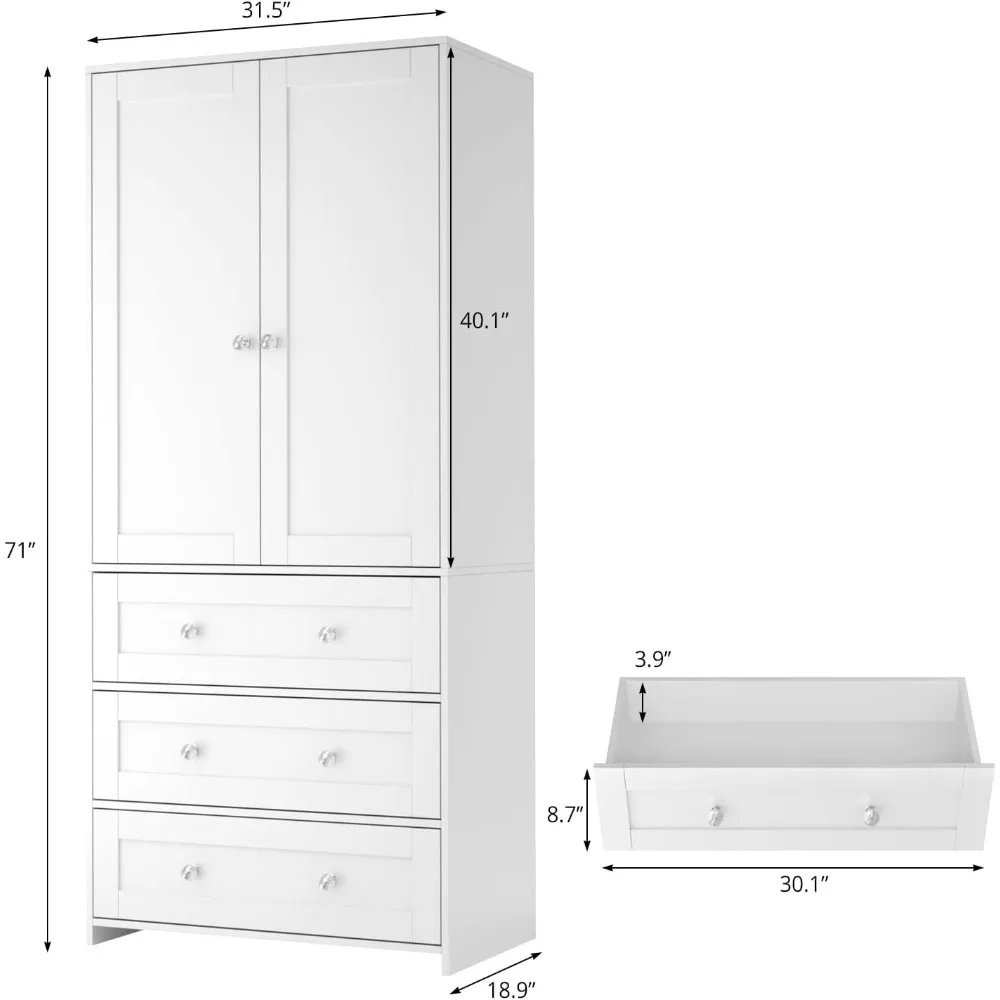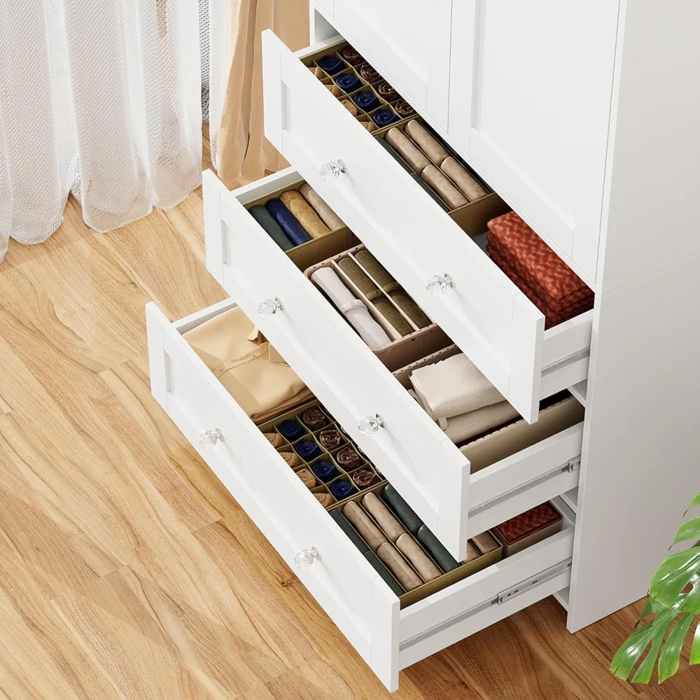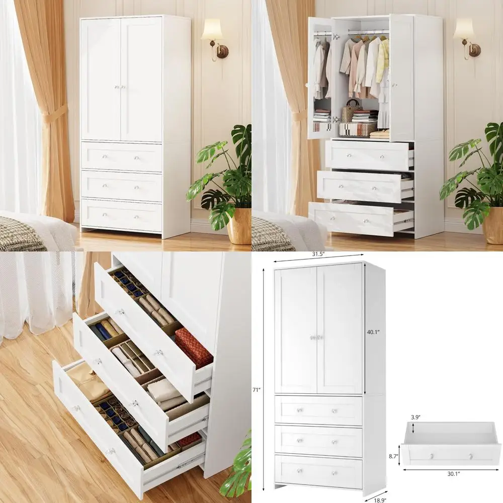This wardrobe closet is designed with a large mirror and crystal knobs, providing a full view of yourself and adding an elegant and noble touch to your bedroom. It features a spacious interior with a hanging rod and three large drawers, perfect for organizing clothes such as dresses, suits, and pants. Made from high-quality engineered wood, this wardrobe is sturdy and durable, equipped with an anti-tip device for safety and cushioned hinges on the doors for long-lasting use. Versatile in its application, this wardrobe can serve as a living room, bedroom, office storage, or file cabinet, suitable for various spaces like garages, laundry rooms, and basements. The wardrobe is easy to assemble with clear installation instructions and labeled parts, making it a convenient upgrade for your storage needs.